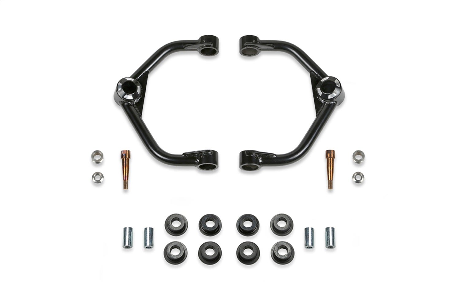Fabtech's Uniball Upper Control Arms provide increased strength to the front suspension by replacing the stock ball joint upper arms that can become worn and eventually fail under aggressive offroad use. These heavy duty upper arms are designed for longevity in rugged offroad conditions. They also feature additional caster compared to stock upper arms for superior on road use with oversized tires. The top quality construction of these arms include .120" wall 1.50" OD 4130 Chromoly tubing and American made 1" FK Stainless PTFE lined Uniballs. The 17-4 Stainless Steel heat treated Uniball pins fit into the factory ball joint tapers without modification to the spindle for easy return to stock feature. Fabtech uses 17-4 Stainless steel for the misalignments that provide proper clearance of the 1" Uniballs throughout the travel range. On the frame side of the upper arms, there are quality urethane bushings that help reduce road noise while providing longevity. Fabtech's Uniball Upper Control Arms are an excellent upgrade to stock or lifted suspension systems for drivers that demand the best for their vehicle.