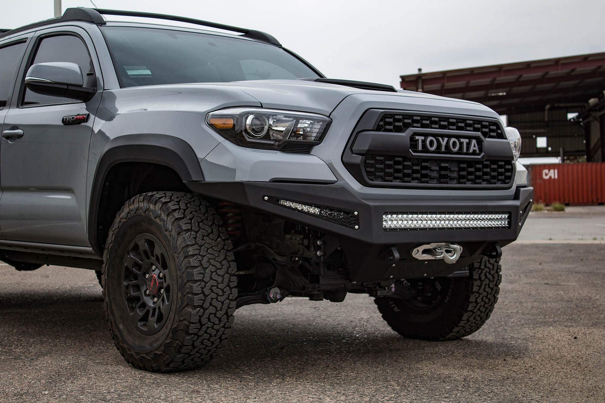 The HoneyBadger front bumper is one of our toughest bumpers yet. Made with 1/8 in. external steel plating and 3/16 in. internal structure plating. And removable 1/8 in. aluminum accent panels. With an aggressive style the HoneyBadger front bumper for the Toyota Tacoma gives your truck a tough look, while providing superior protection to your front end components. Reinforced clevis mounts made from 1" steel are designed to accommodate a 3/4 in. D-ring. Our universal light mount system in the center of the bumper allows for up to 8 Duallys or a 30 in. Straight or Radius LED bar to be mounted. Mix and match any brand and size lights with the universal light kit to create the perfect lighting combination for your needs. Additional lighting options are available behind the side accent panels, accepting a Rigid Industries 10 in. LED on each side.