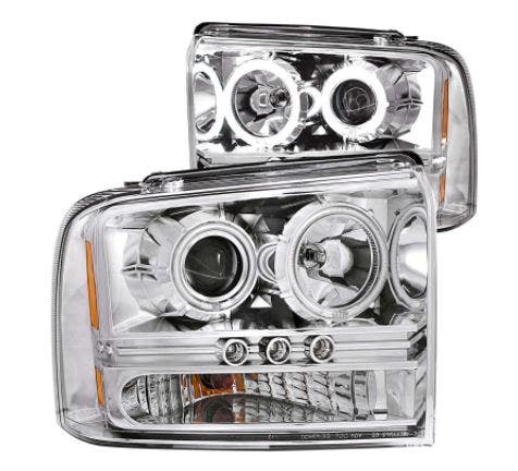 Projector Headlight Set, w/Halo, Clear Lens, Chrome Housing, Pair, w/1 pc. LED, . Guaranteed To Improve Your Vehicles Appearance. Rigorously Tested For Fit And Function. Simple Plug And Play. No Modifications Required. Easy Installation Using Common Hand Tools. Uses Stock Mounting Locations And Hardware. D.O.T. Compliant To S.A.E. Standards. Sold As A Pair. Does Not Fit F-250 Light Duty Or Sealed Beam Models.