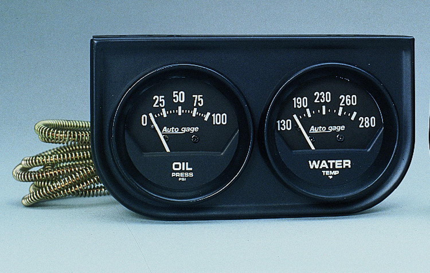 Autogage Black Oil/Water Black Console; 2-1/16 in.; Black Dial Face; White Pointer; White Incandescent Lighting; Mechanical; 0-100 PSI/130-280 Degree F;