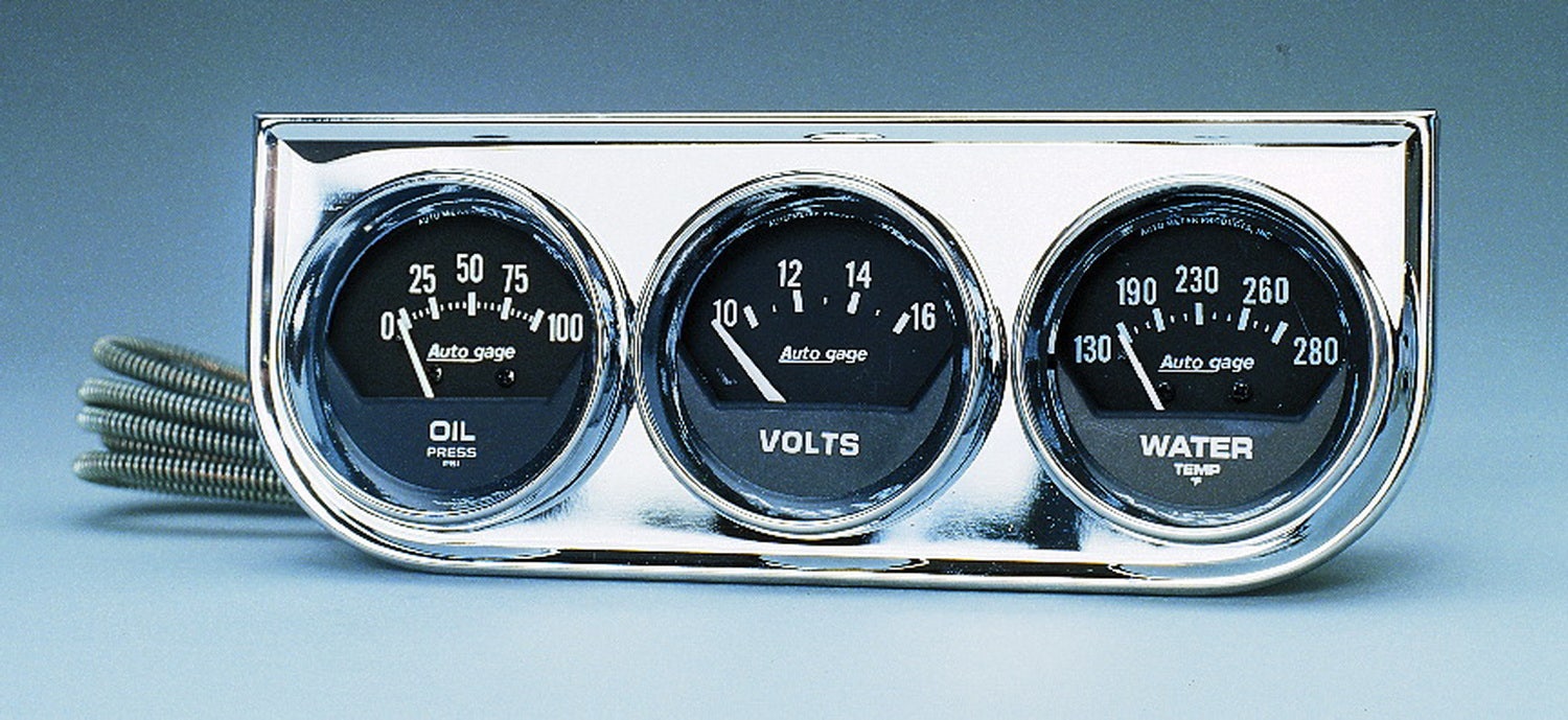 Autogage Black Oil/Water/Volt Chrome Console; 2-1/16 in.; Black Dial Face; White Pointer; White Incandescent Lighting; Mechanical; 0-100 PSI/10-16V/130-280 Degree F;