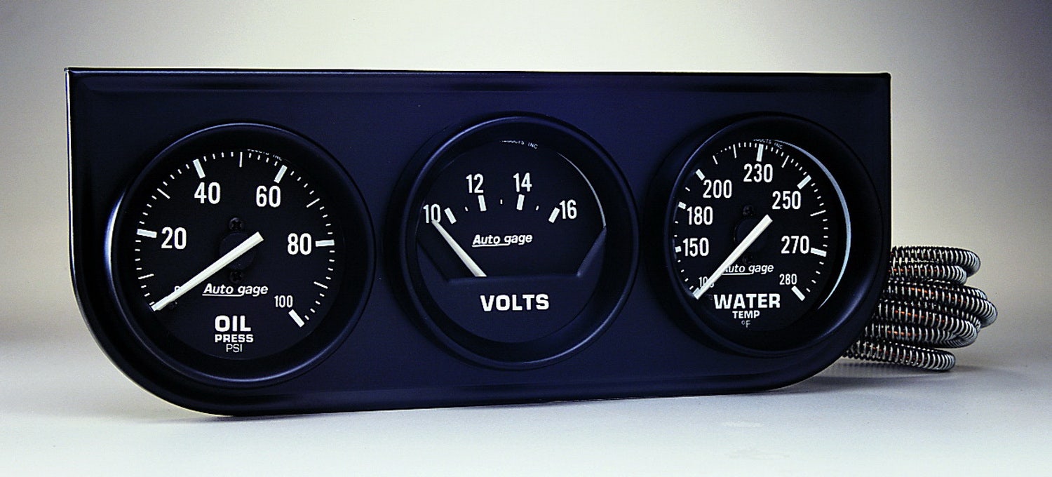Autogage Oil/Volt/Water Black Console; 2-1/16 in.; Black Dial Face; White Pointer; White Incandescent Lighting; 0-100 PSI/10-16V/130-280 Degree F;