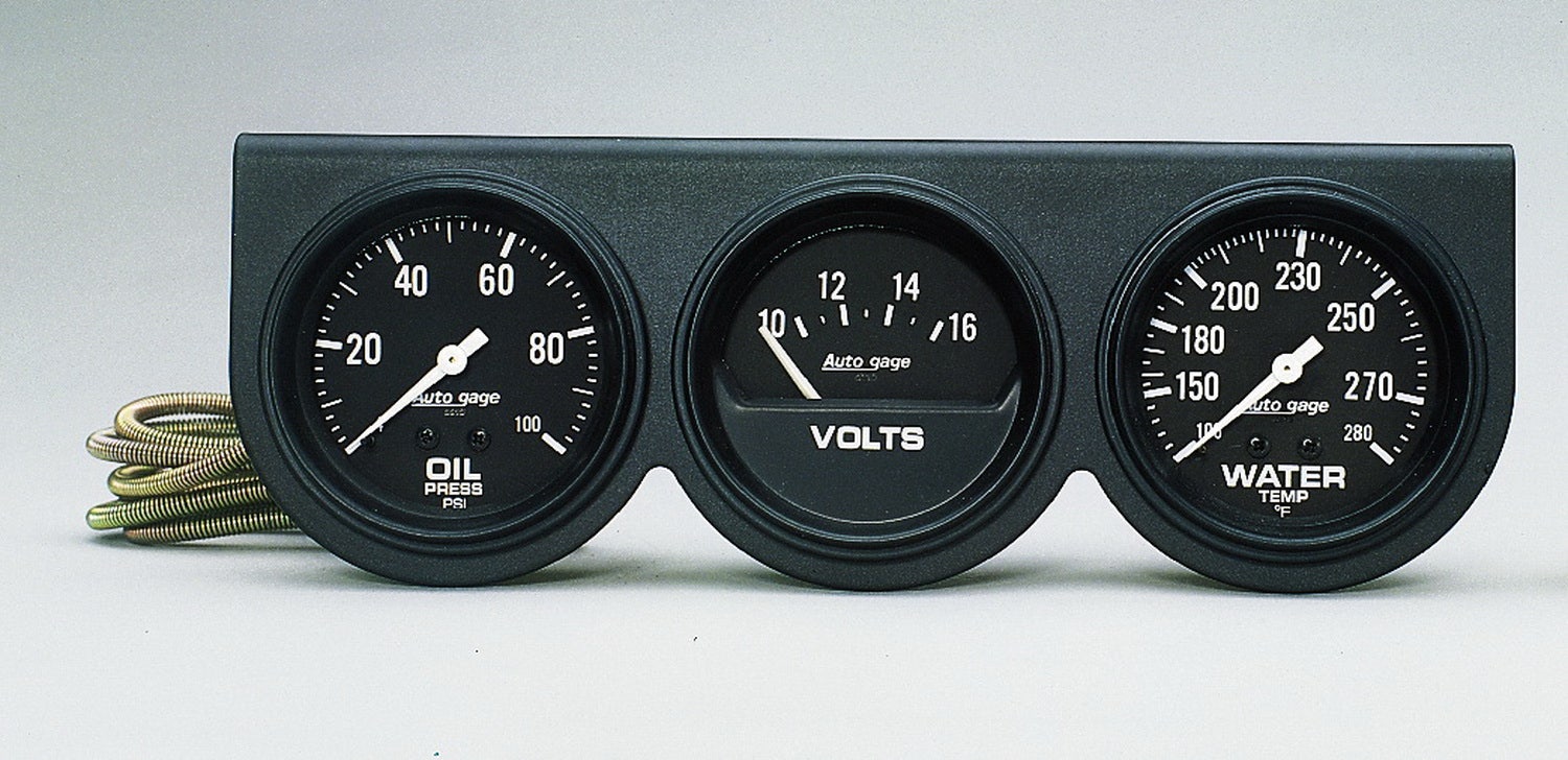 Autogage Black Oil/Volt/Water Black Console; 2-5/8 in.; Black Dial Face; White Pointer; White Incandescent Lighting; 0-100 PSI/10-16V/130-280 Degree F;