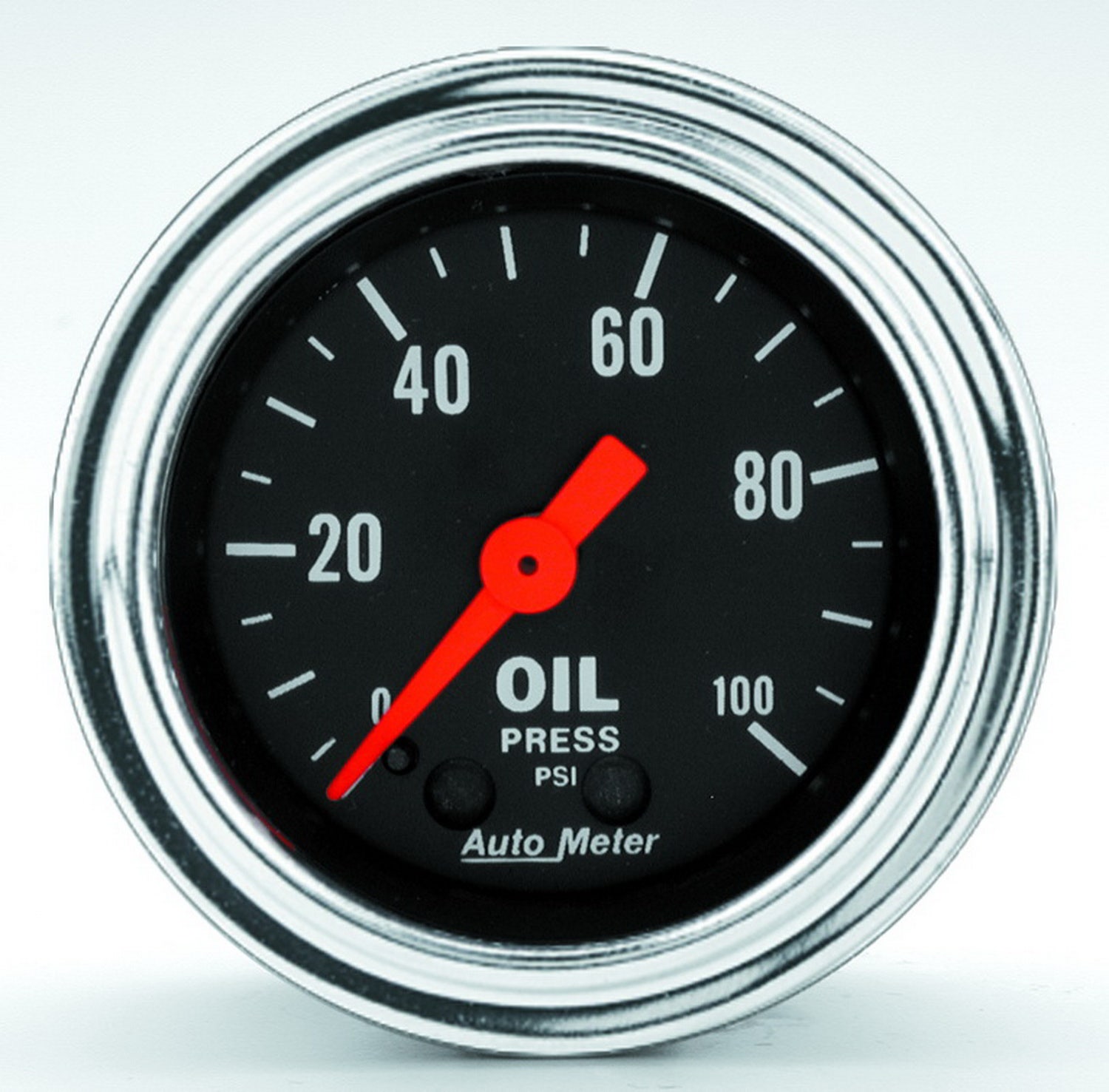 Traditional Chrome Mechanical Oil Pressure Gauge; 2-1/16 in.; Black Dial Face; Fluorescent Red Pointer; White Incandescent Lighting; Mechanical; 0-100 PSI;