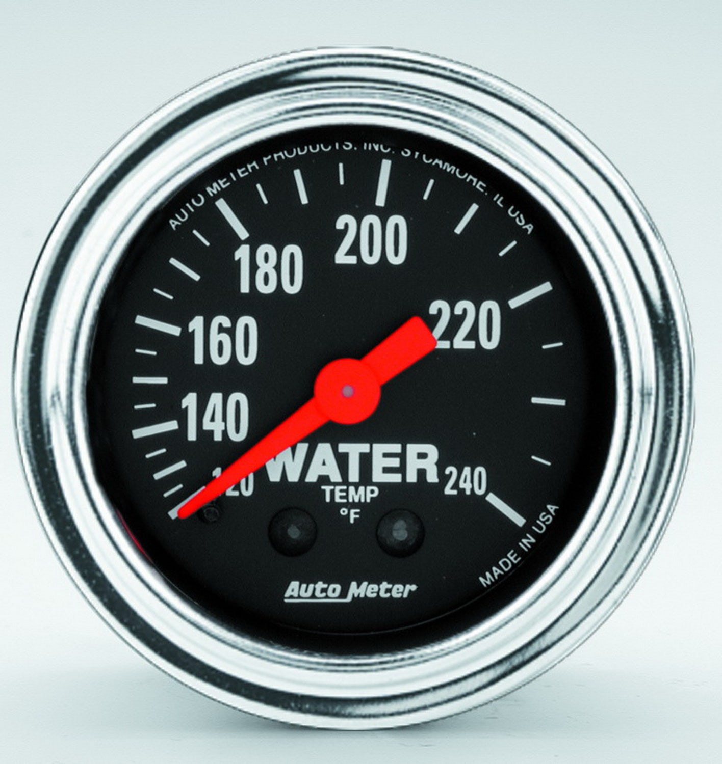 Traditional Chrome Mechanical Water Temperature Gauge; 2-1/16 in.; Black Dial Face; Fluorescent Red Pointer; White Incandescent Lighting; Mechanical; 120-240 Degree F; 12 ft.;