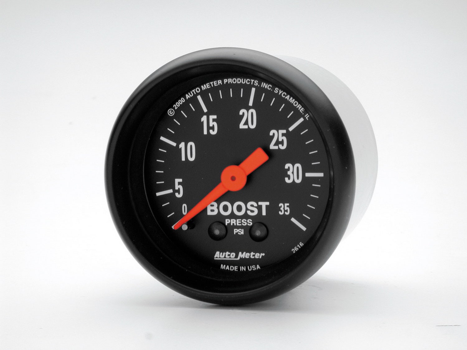 Z-Series Mechanical Boost Gauge; 2-1/16 in.; Black Dial Face; Fluorescent Red Pointer; White Incandescent Lighting; Mechanical; 0-35 PSI;