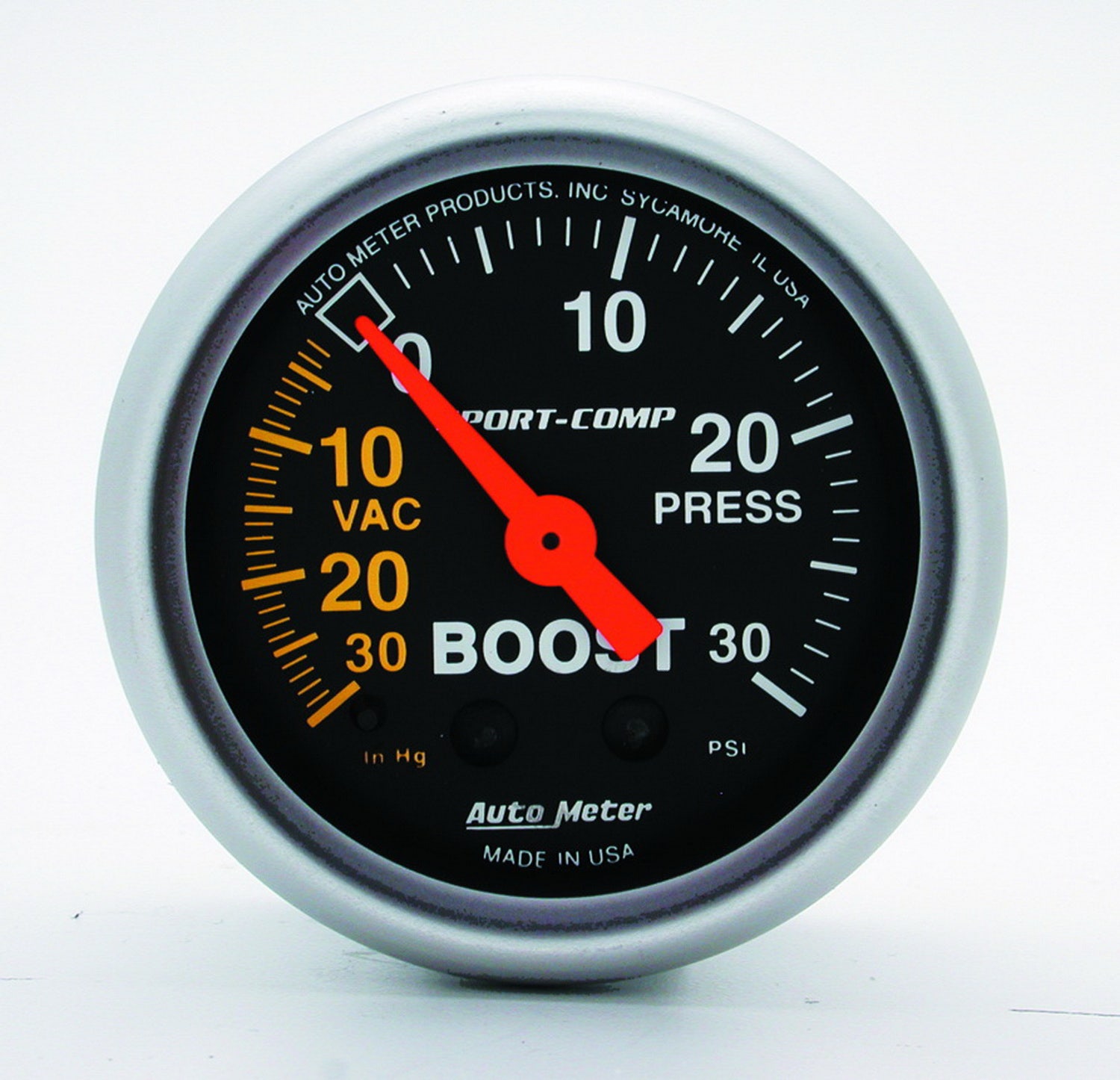 Sport-Comp Mechanical Boost/Vacuum Gauge; 2-1/16 in.; Black Dial Face; Fluorescent Red Pointer; White Incandescent Lighting; Mechanical; 30 IN HG/30 PSI;