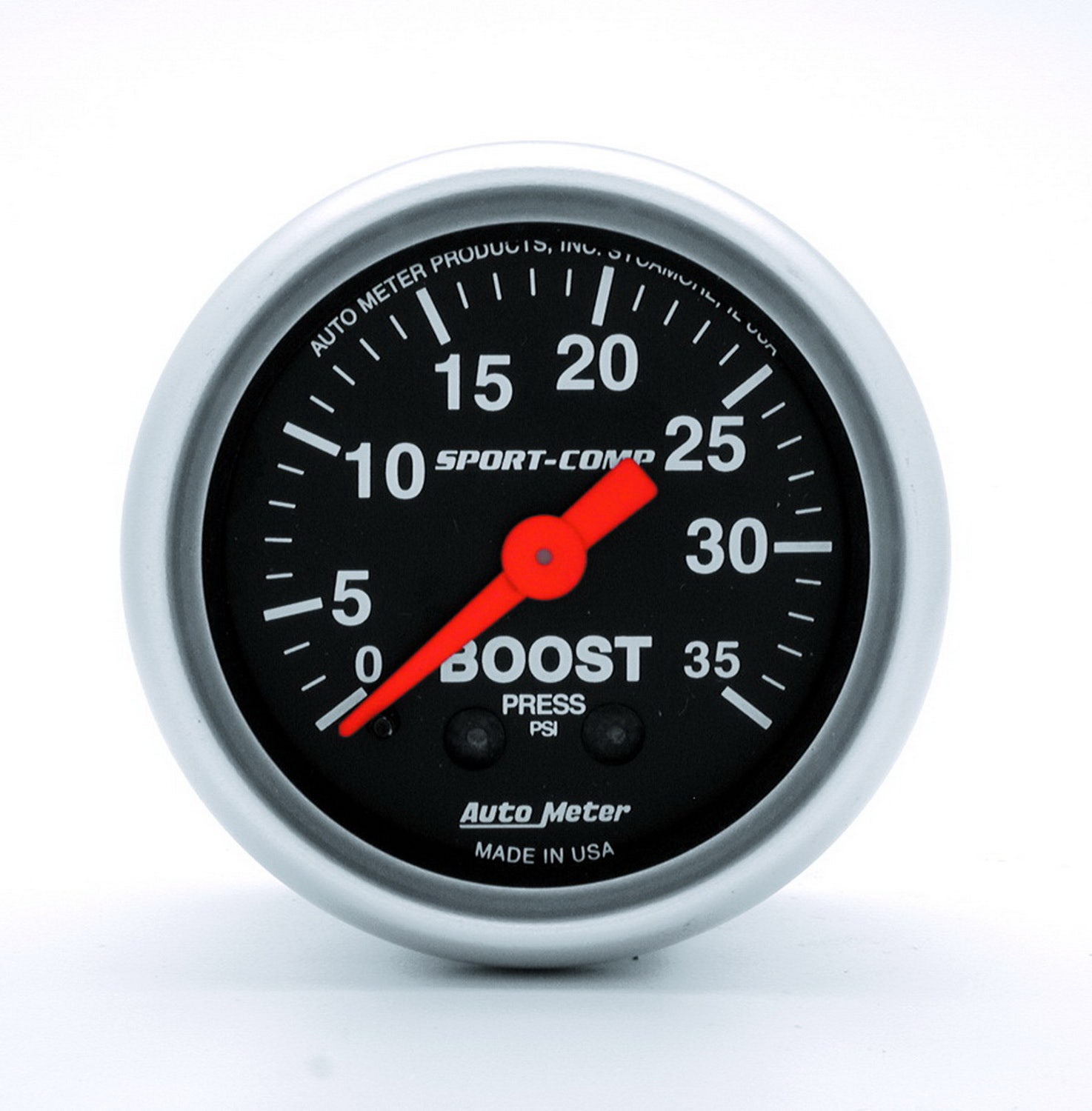 Sport-Comp Mechanical Boost Gauge; 2-1/16 in.; Black Dial Face; Fluorescent Red Pointer; White Incandescent Lighting; Mechanical; 0-35 PSI;
