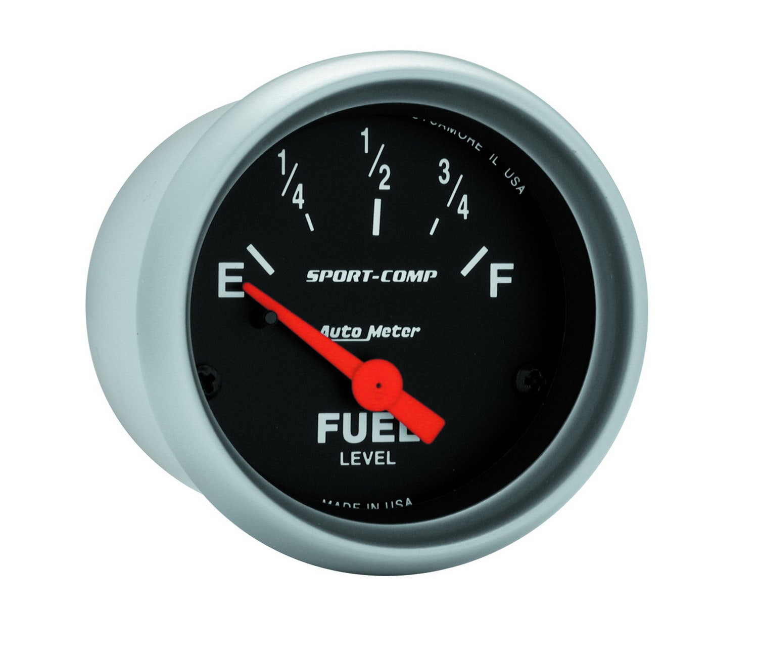 Sport-Comp Electric Fuel Level Gauge; 2-1/16 in.; Black Dial Face; Fluorescent Red Pointer; White Incandescent Lighting; Electric Air-Core; 0 Ohms Empty /90 Ohms Full;