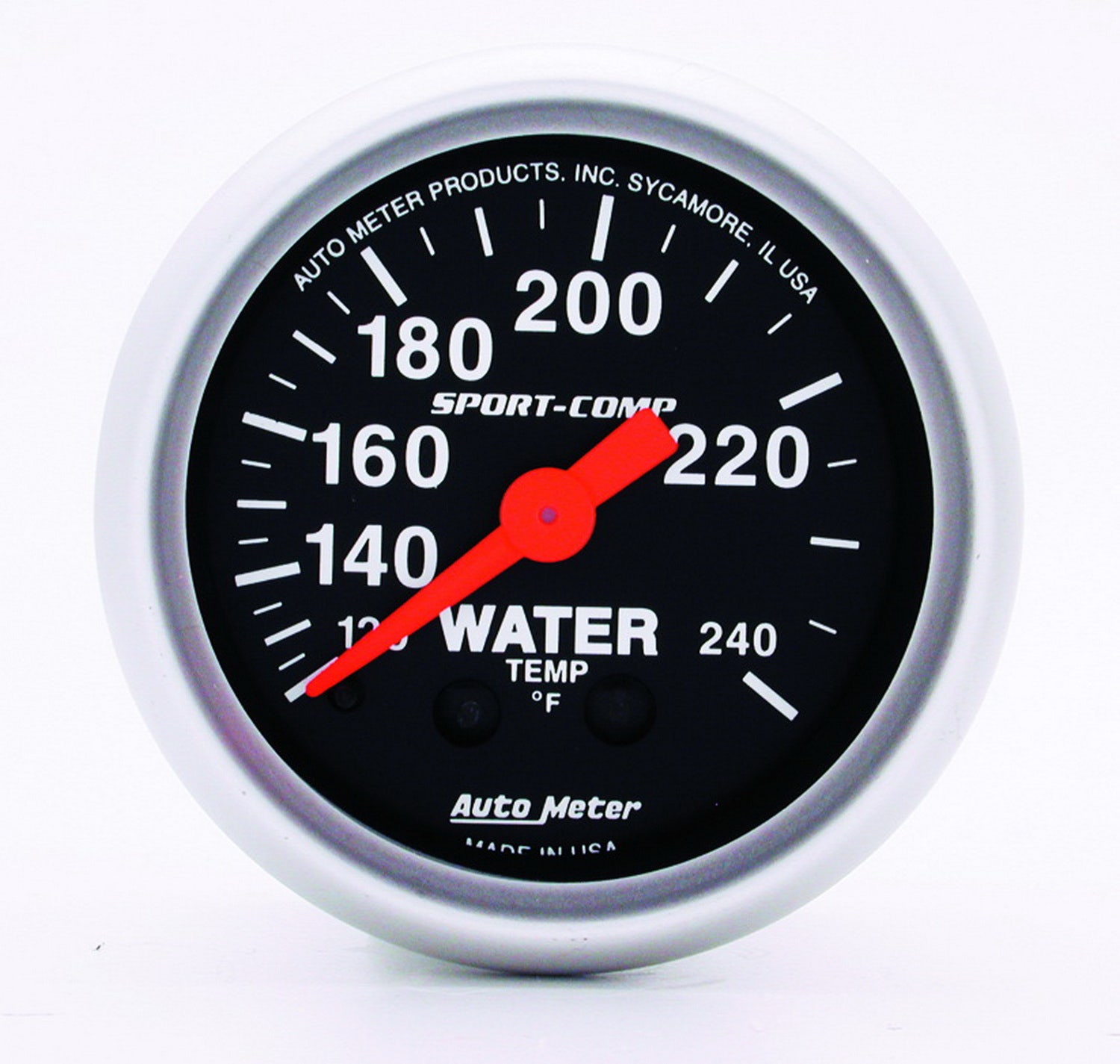 Sport-Comp Mechanical Water Temperature Gauge; 2-1/16 in.; Black Dial Face; Fluorescent Red Pointer; White Incandescent Lighting; Mechanical; 120-240 Degree F;