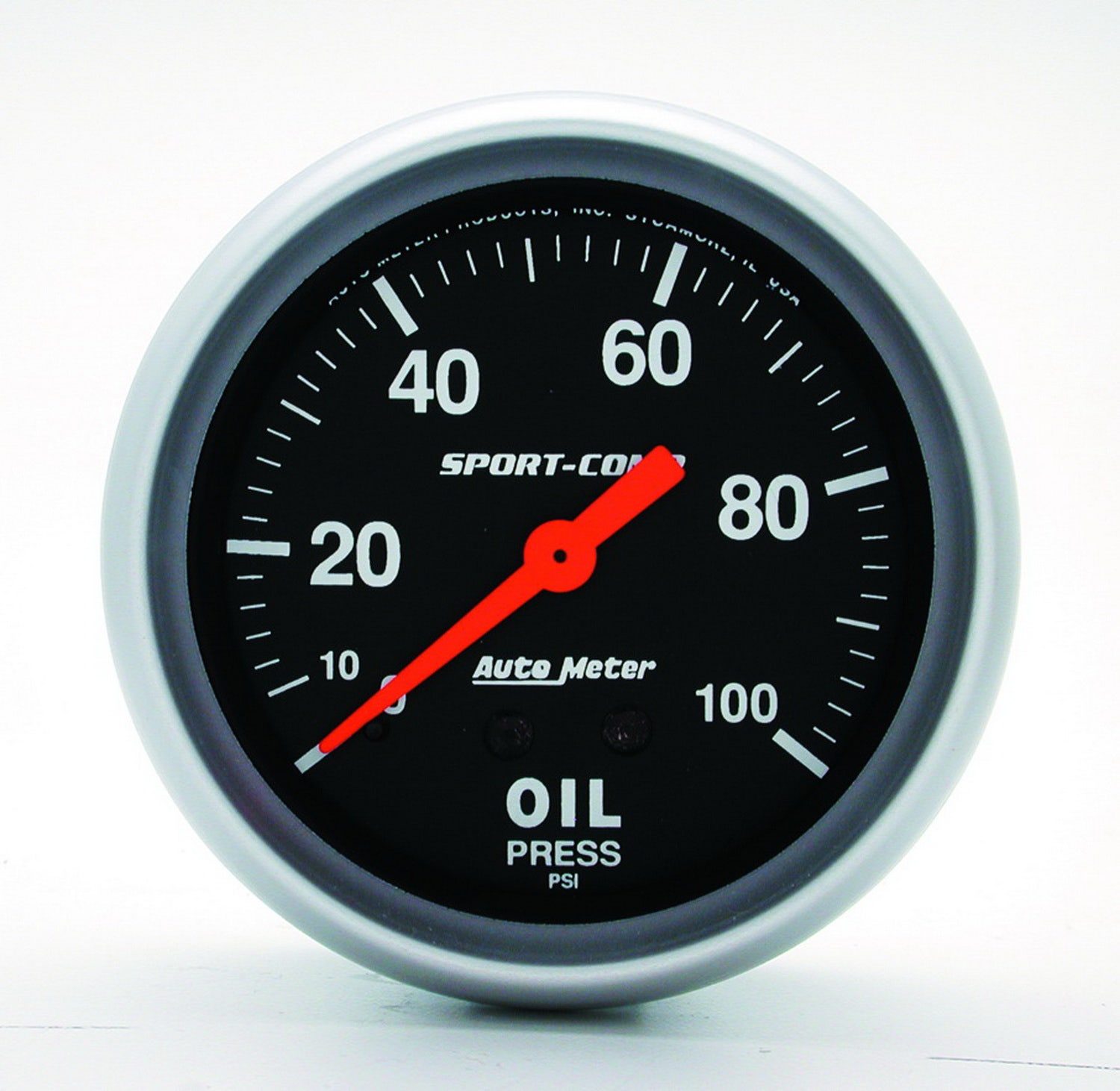 Sport-Comp Mechanical Oil Pressure Gauge; 2-5/8 in.; Black Dial Face; Fluorescent Red Pointer; White Incandescent Lighting; Mechanical; 0-100 PSI;
