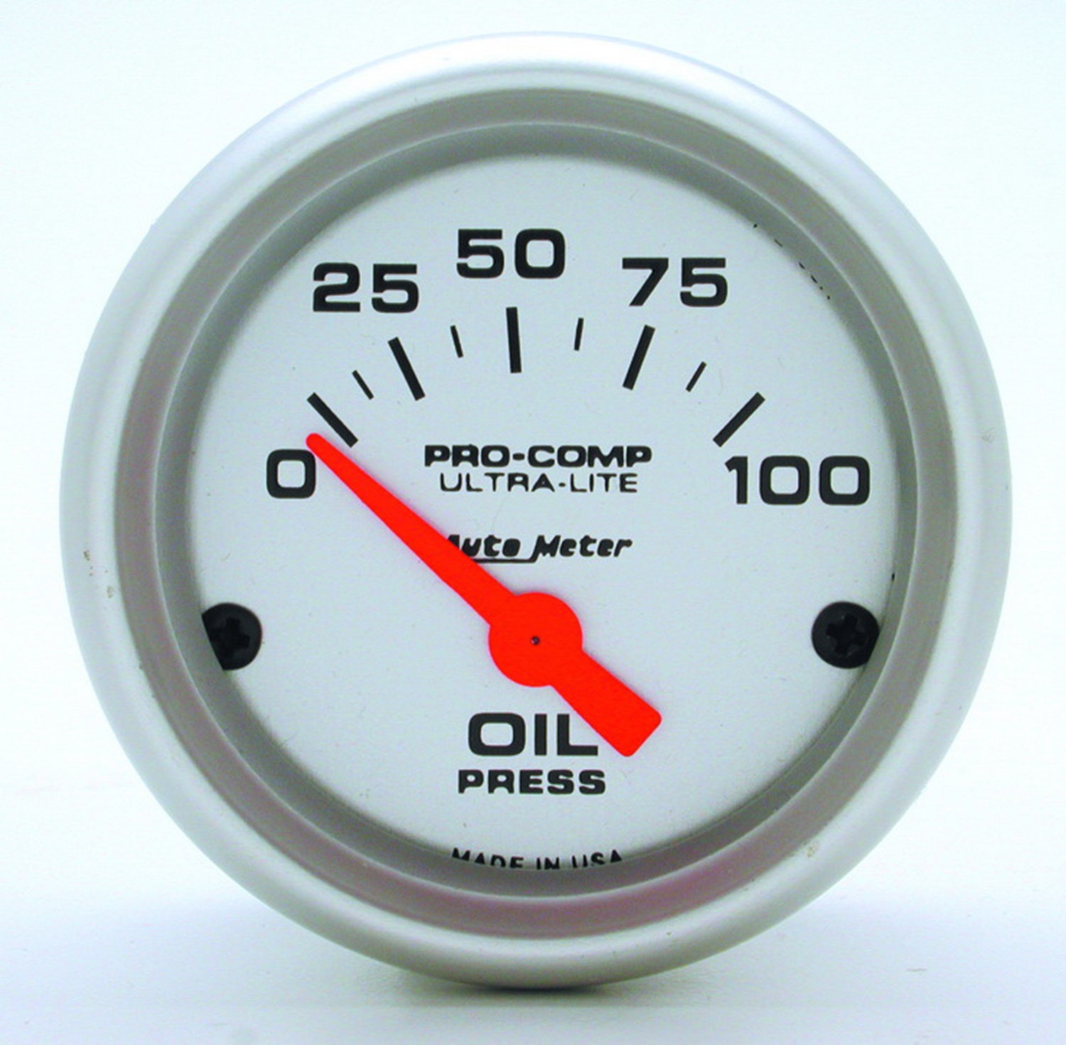 Ultra-Lite Electric Oil Pressure Gauge; 2-1/16 in.; Silver Dial Face; Fluorescent Red Pointer; White Incandescent Lighting; Electric Air-Core; 0-100 PSI;