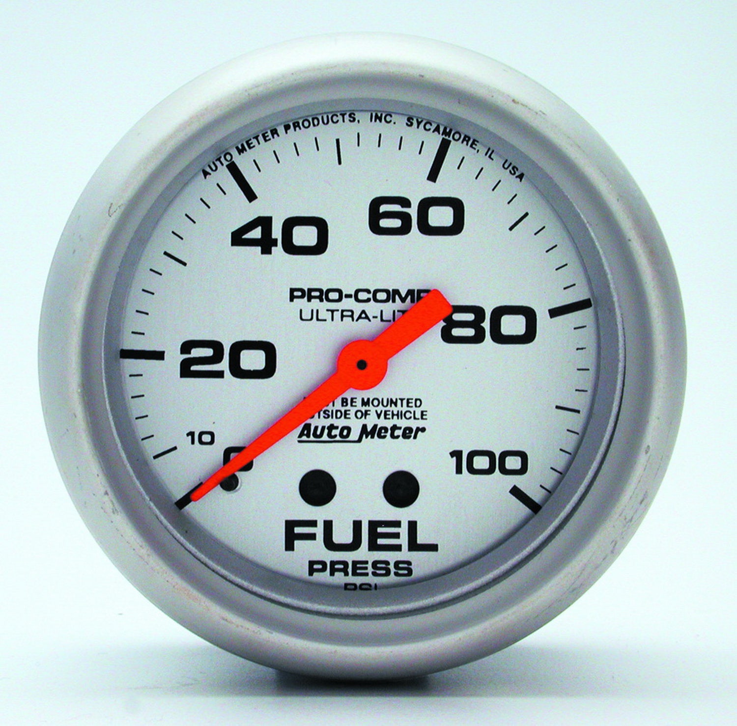 Ultra-Lite Mechanical Fuel Pressure Gauge; 2-5/8 in.; Silver Dial Face; Fluorescent Red Pointer; White Incandescent Lighting; Mechanical; 0-100 PSI;