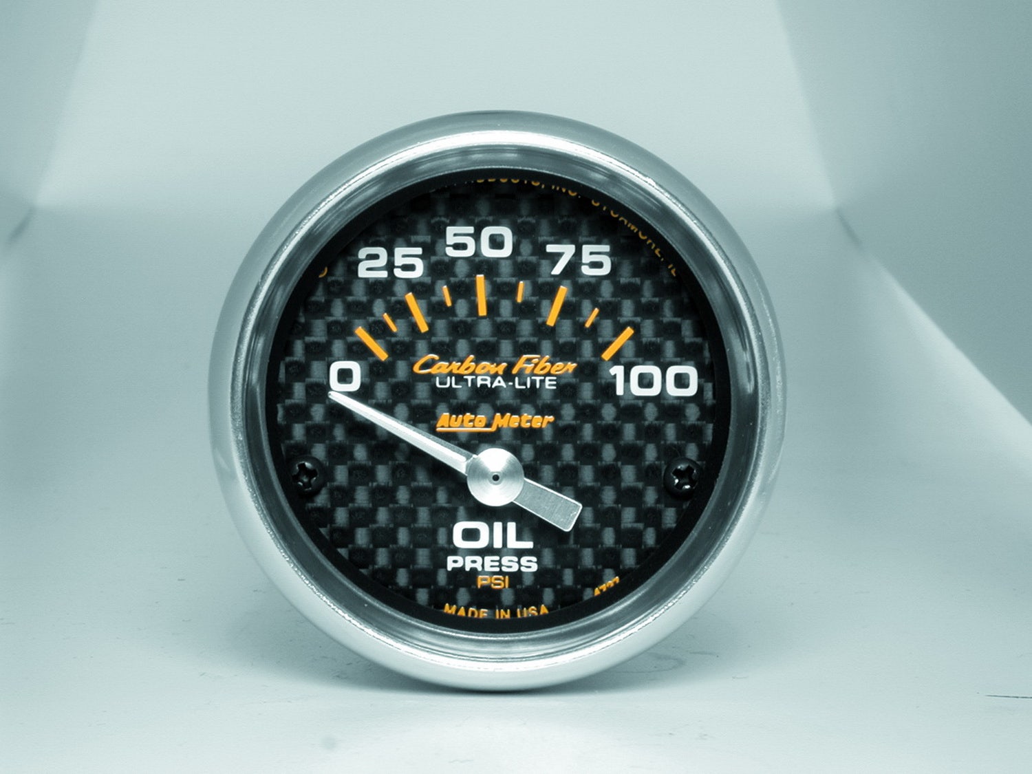 Carbon Fiber Electric Oil Pressure Gauge; 2-1/16 in.; Carbon Fiber Dial Face; Silver Pointer; White Incandescent Lighting; Electric Air-Core; 0-100 PSI;
