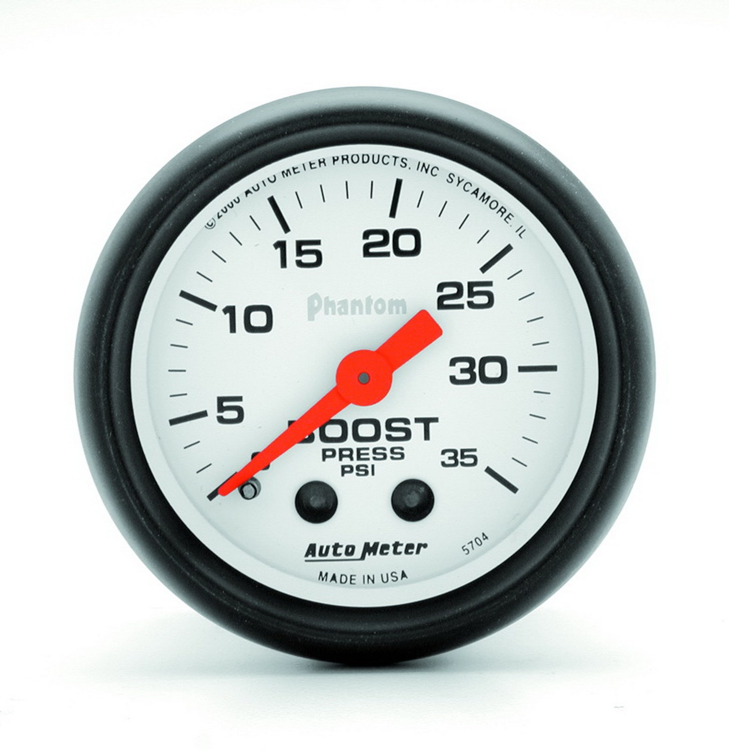 Phantom Mechanical Boost Gauge; 2-1/16 in.; White Dial Face; Fluorescent Red Pointer; White Incandescent Lighting; Mechanical; 0-35 PSI;