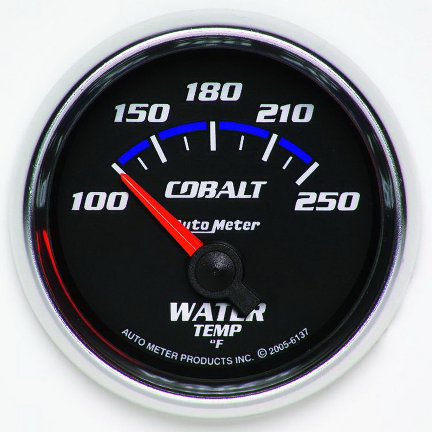 Cobalt Electric Water Temperature Gauge; 2-1/16 in.; Black Dial Face; Fluorescent Red Pointer; Blue LED Lighting; Electric Air-Core; 100-250 Degree F;