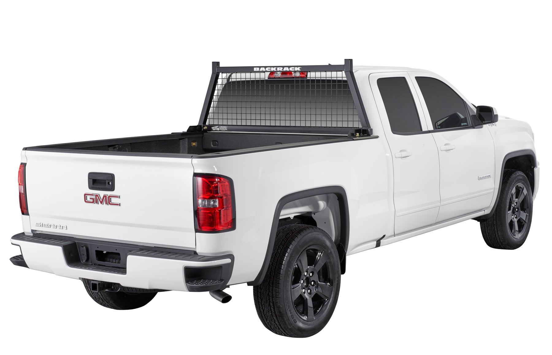Has welded wire mesh to provide full window protection. Has wider carrying capacity above cab. Each intersection of wire is welded to avoid rattling and provide strength. Less flexibility to mount accessory light brackets than the BACKRACK(TM). Is more expensive than the BACKRACK(TM). Sits higher above the cab than the BACKRACK(TM).