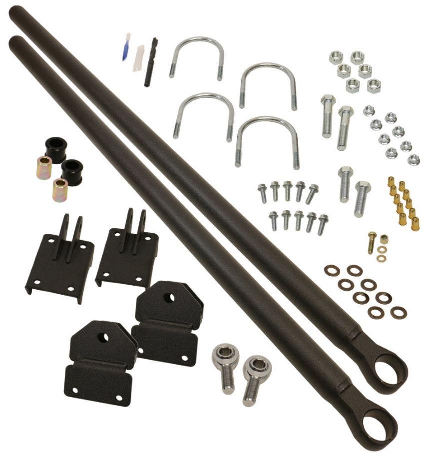 2-inch OD tube with QA1 3/4-inch heavy duty American 28,000 lbs rod ends. Prevents wheel hop, axle wrap and large angles on U-joints. No adjustment is needed when pulling or hauling. Designed for trucks ranging from a 6-inch lift all the way to a 2-inch drop. Polyurethane bushings provide direct loading without excessive movement unlike spring loaded designs. Optimized to arc in the same path the axle travels during suspension movement which makes for a smooth ride and the ability to tow without having to adjust the bars. All necessary hardware and Rivet-nut specific drill bit and tool included. 54-inch eye-to-eye length.
