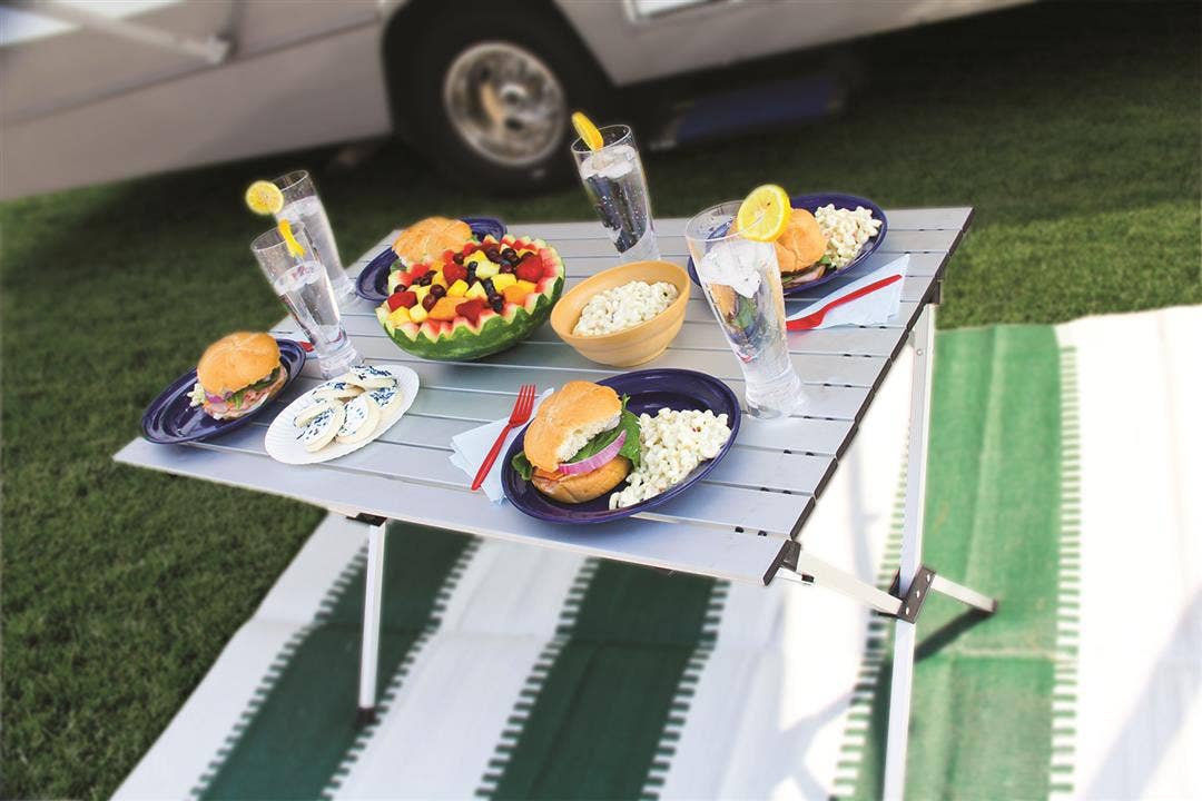 Camco Aluminum Roll-Up Table with Carrying Bag Lightweight & Easy-to-Carry Comfortably Sits 4-6 People Ideal for Tailgating, Camping, the Beach, Parties & More (51892)