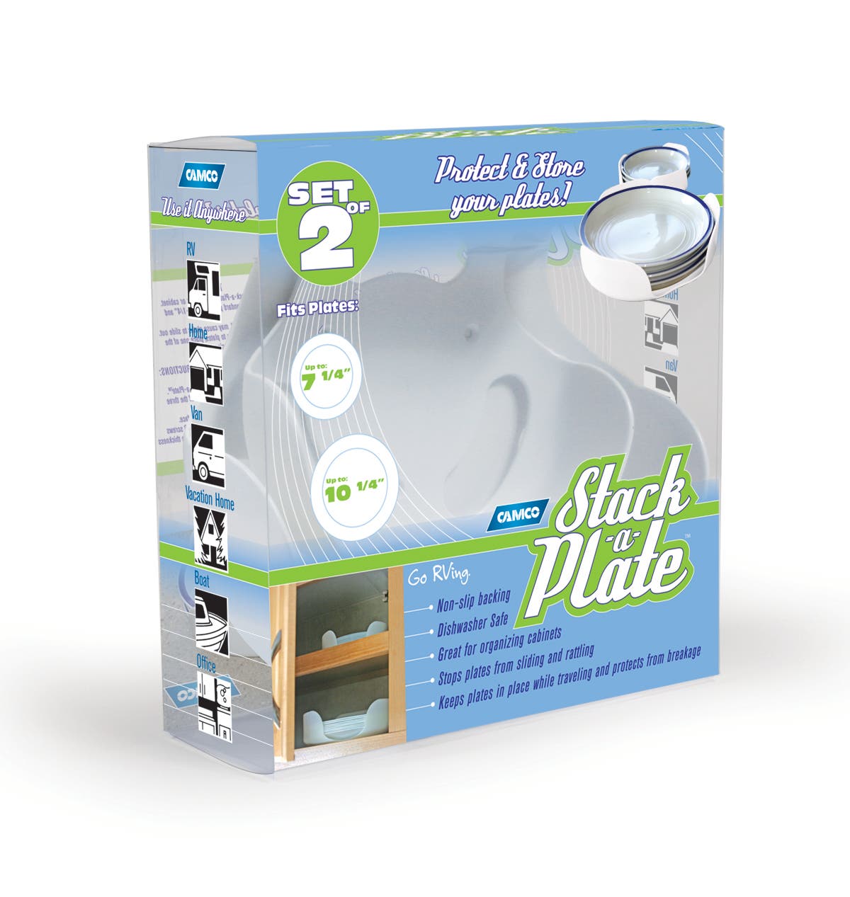 Camco Stack-A-Plate- Easily Organize, Store and Protect Plates During Travel, Non- Slip Backing, Simply Dispense Plates During Later Use, Great For RVs - White (43601)