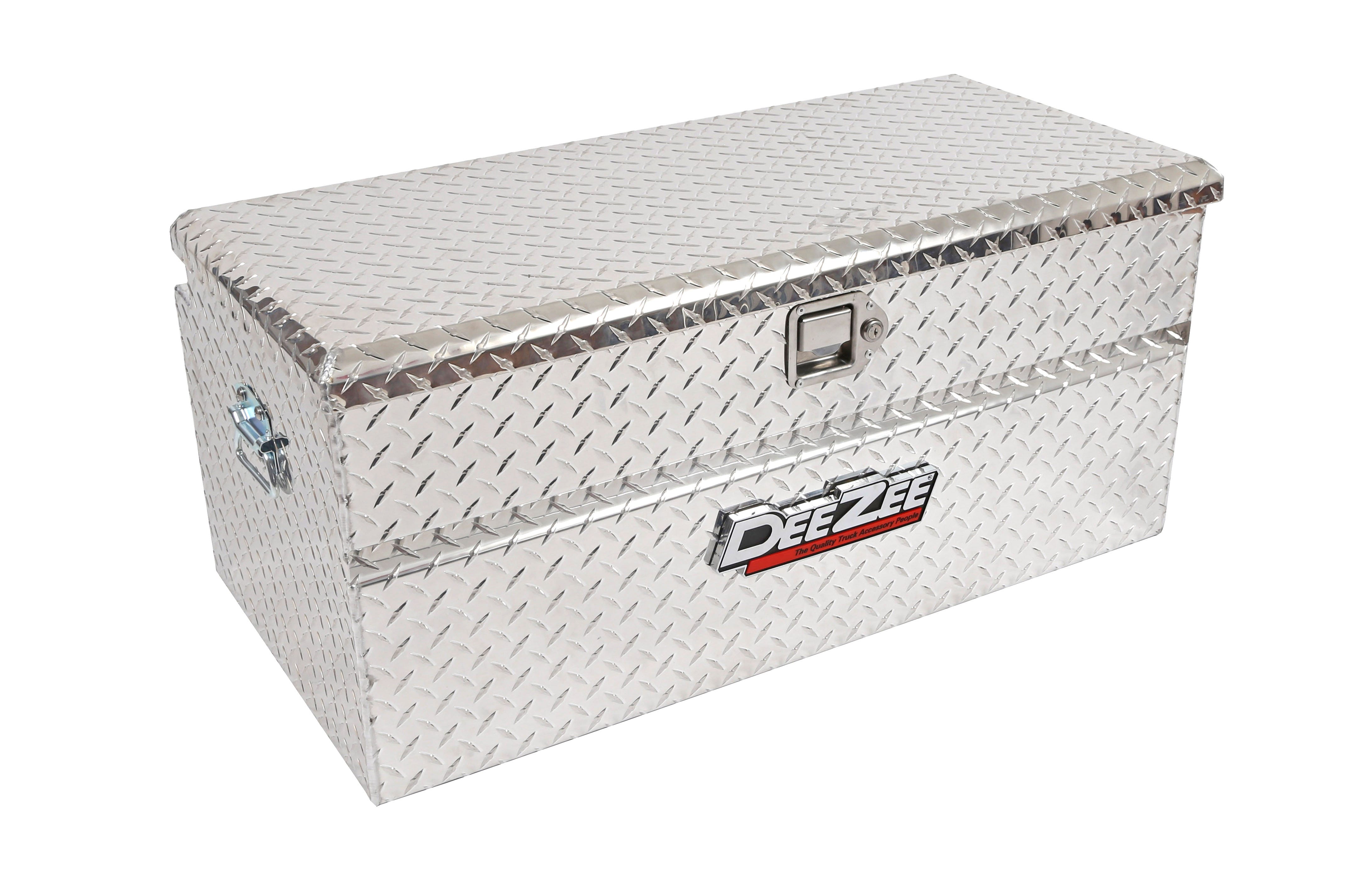 Dee Zee Tool Box - Red Label Chest. Constructed of heavy duty Brite-Tread aluminum. Crown style lid with a full pan double-V stiffener for superior rigidity. Other features: lockable stainless steel paddle handles, dampened gas shocks, closed cell foam gasket, and self-adjusting strikers. Removable plastic tool tray to help keep small items organized.