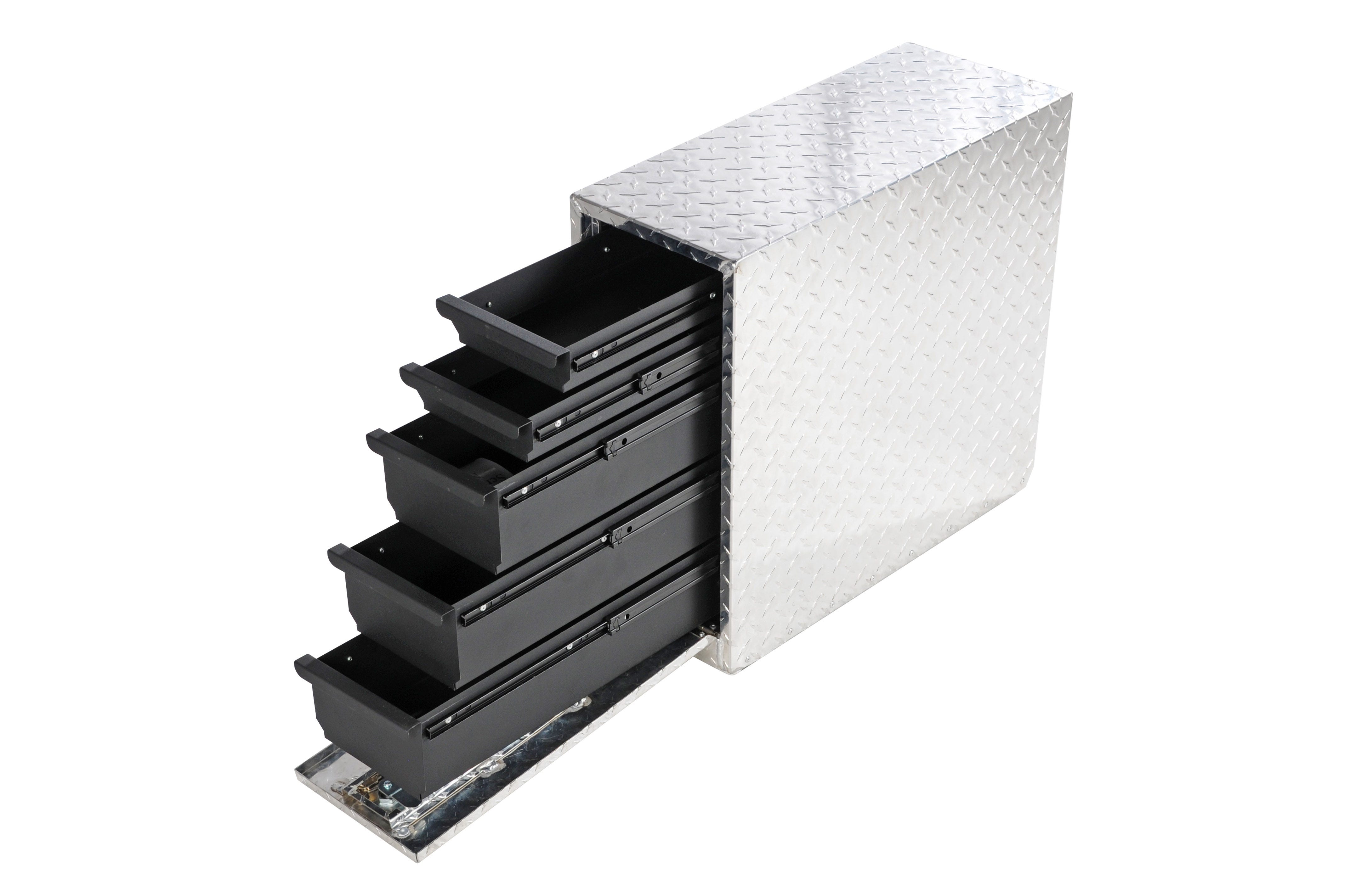 Specialty Series Wheel Well Tool Box; 0.056 Brite-Tread Aluminum; Volume 1.9 cu. ft.; L 20.5 in. x W 8.5 in. x H 18.875 in.; 5 Drawer w/Single Door Opening;