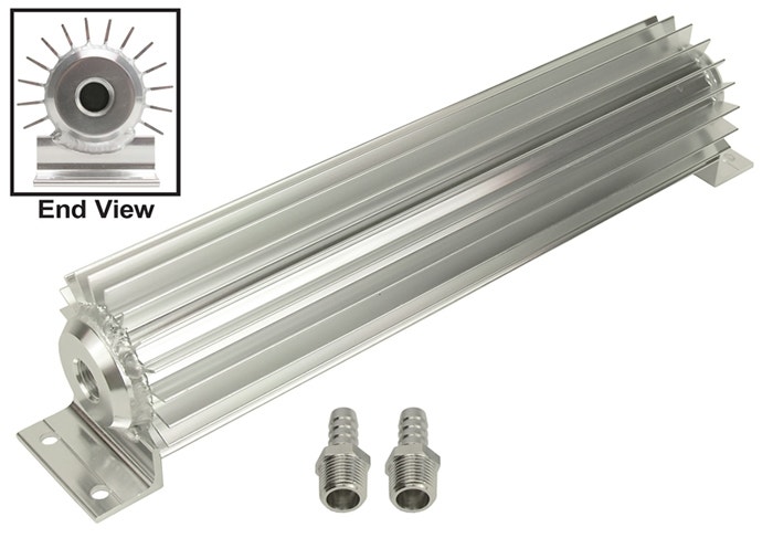 Our compact all aluminum Heat Sink cooler uses both external and internal fins to maximize heat transfer. With a 3" diameter it can be mounted in a variety of locations and the universal design can be used to cool a wide variety of components. Perfect for fuel and power steering applications, this powerful little heat exchanger can also be used to cool engine oil and transmission fluid in light duty applications. Includes hose barbs.