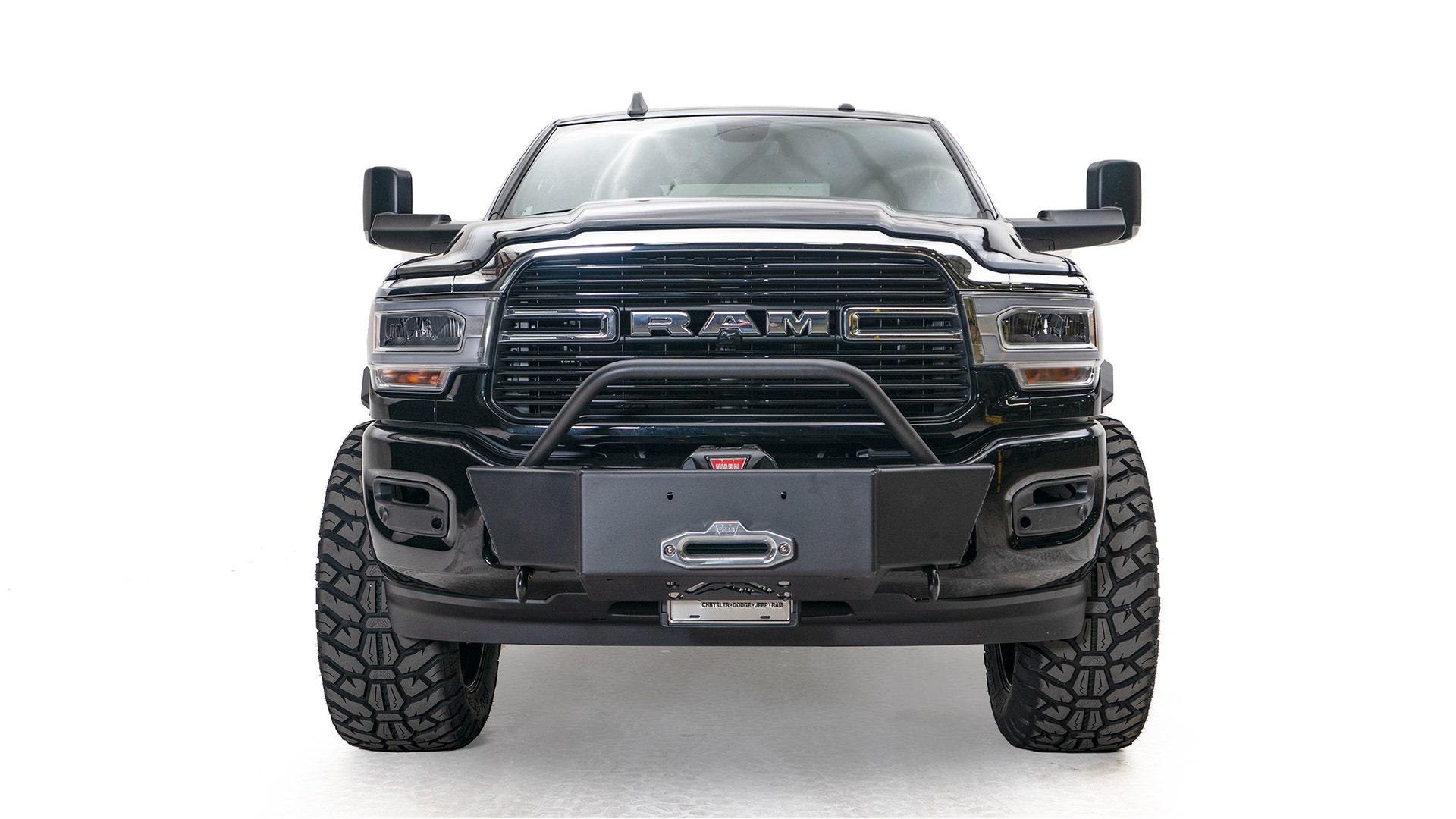 2019 Dodge HD 2500-3500; One piece Winch Mount; Fully Welded; No parts or brackets to put together; Slips through the factory tow hook slots straight to the frame; Complete bolt-on front bumper w/ provided brackets that tie directly to the frame; 2 integrated pod mounts; Holds 16,000lb or smaller winch; 2 Stage Matte Black Powder Coat; 1/4" U.S. Steel Construction; 100% Made in the USA