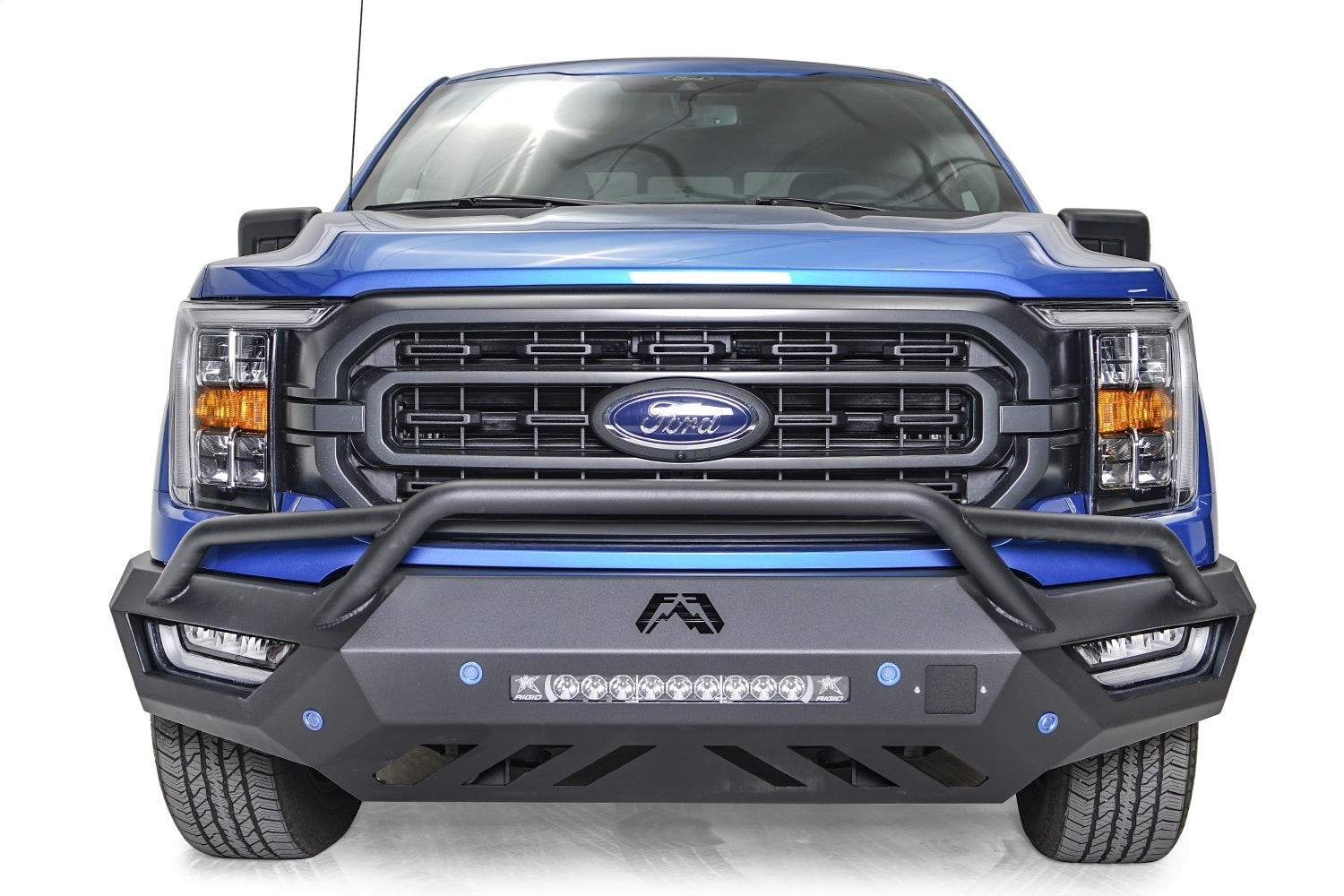 Fab Fours' line of light weight bumpers: Vengeance Series. These premium steel sensor bumpers are engineered to be light weight and offer a sleek and stylish finish for both the front and rear of your vehicle. Integrated 20 inch LED light bar housing in the center and mounting options on each side for (3) 3?x3? cube LEDs to give you maximum LED light coverage. Also allows for the OEM Fog LIghts for that off the showroom style. The fit of this bumper is high and tight and comes with lower cutouts to provide increased airflow; while also giving you that aggressive look both on and off the road. Available in a no guard or pre-runner guard option.