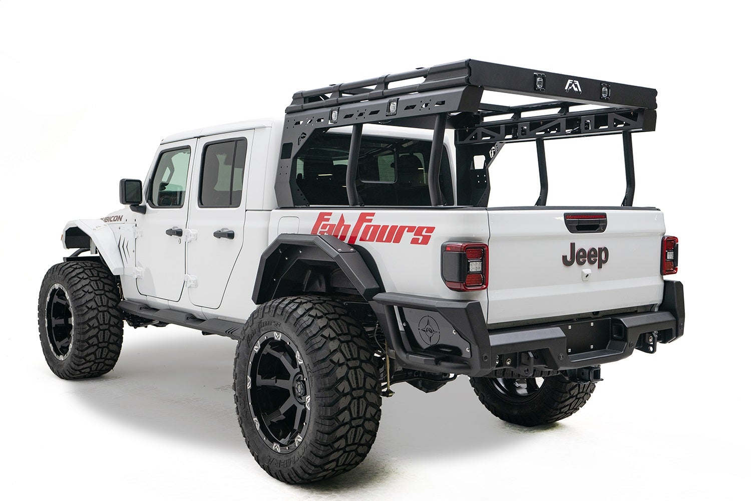 The perfect combination of form and function. The Fab Fours' Overland Rack for the Jeep Gladiator was made for the ultimate adventurous spirit. Key features include multiple mounting points; multiple tie down points; integrated pod mounts; expandable design (with optional front rack. Coming soon); ability to make solid floor by purchasing extra cross member (sold separately), Integrated roof access step; Ease of Installation, 12 GA Steel construction. Manage your cargo with ease with this adaptable and expandable overland rack. Always Made in the USA!