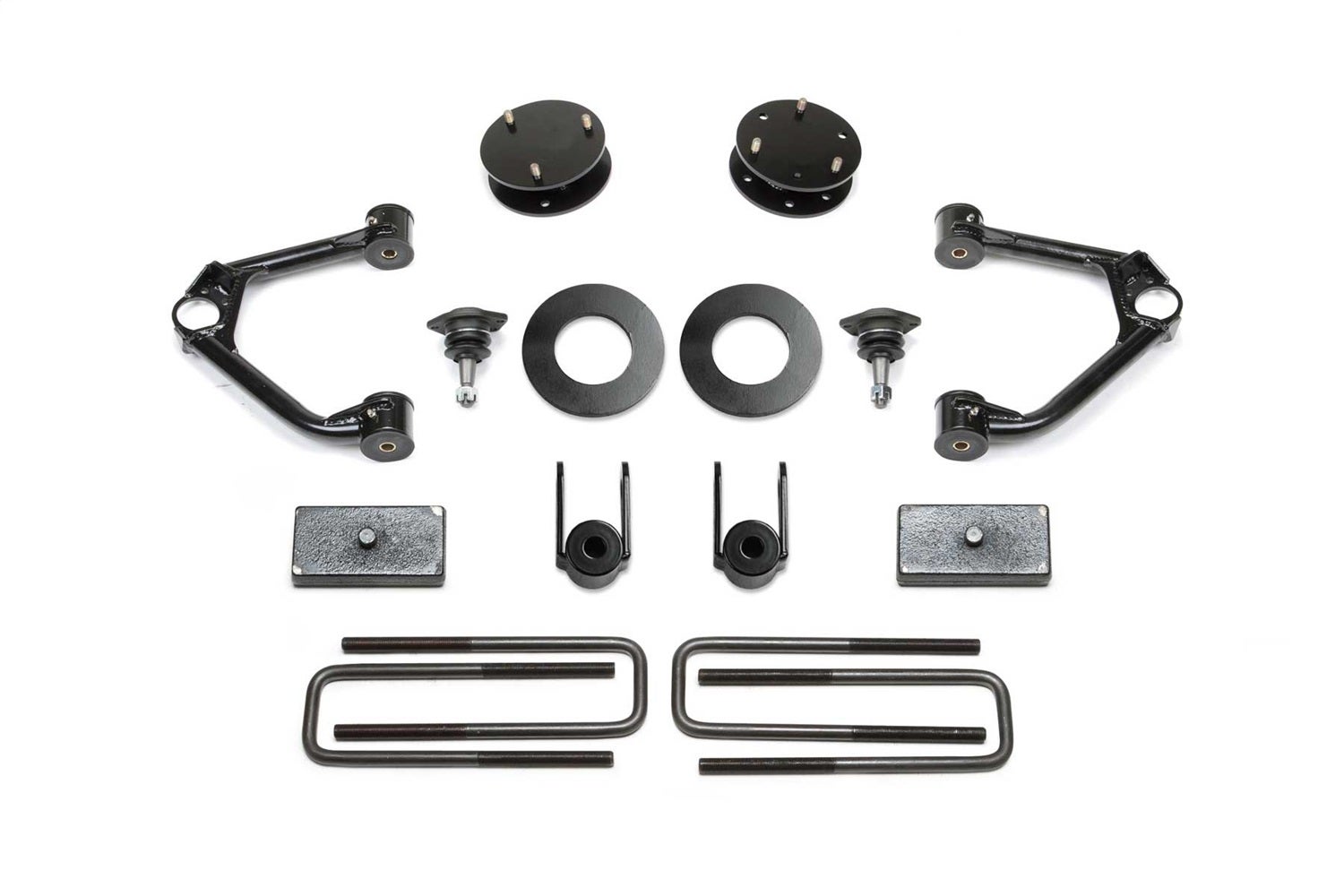 Fabtech's Upper Control Arm system provides a 3.5" increased ride height over stock without creating suspension bind at full droop. Lift is accomplished with steel spacers that utilizes the factory Adaptive Ride Control coilovers. The replacement Upper Control Arms address the geometry of the front suspension with the new ride height for proper alignablity. Heavy duty ball joints allow for extended travel to eliminate binding. Rear lift comes from 1.5" blocks and u-bolts. Heavy duty rear shock extension brackets retain the factory Adaptive Ride Control shocks for an outstanding ride quality.