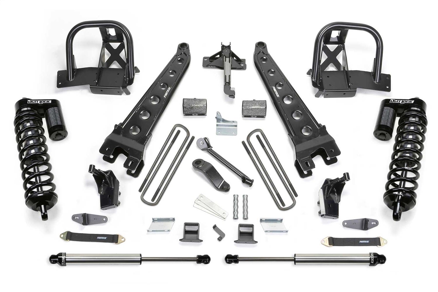 Our patented Radius Arms feature a full tubular structure strengthened by dimple die side plates, with an adjustable alignment cam at the axle to allow caster adjustment. Front spring lift options includes 6 replacement Coil Springs. Completing this system is a Trac Bar relocation bracket, Pitman Arm, Sway Bar drops, and a rear Block & U-bolt kit.