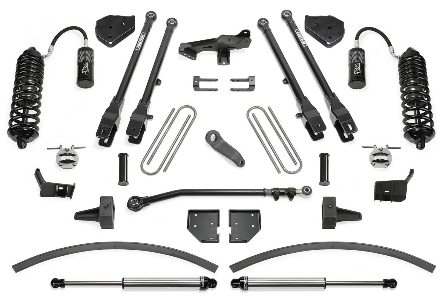 For the ultimate in suspension performance for the Super Duty we offer a bolt on 4 Link System that provides unsurpassed articulation and wheel travel. These 2 diameter heavy wall links feature race style 1 Uniballs for superior strength. Thick 1/4 steel brackets secure the 4 Links to the frame without cutting or welding. The system also includes Sway Bar Drops, Trac Bar relocation bracket, Pitman Arm, and U-Bolt kit.