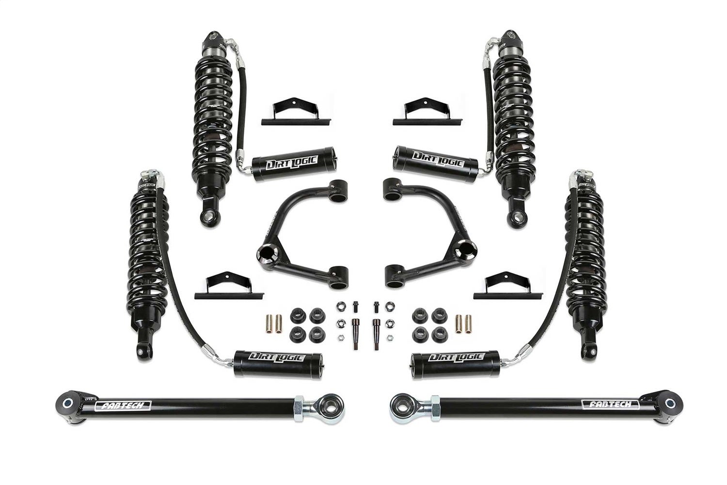 This high quality suspension has been designed to upgrade GM 1500 SUV's with standard suspension for increased strength and a balanced compliant ride for both on and offroad. The front suspension receives Fabtech's heavy duty Uniball Upper Control Arms and Dirt Logic 2.5 Coilover shocks. The Fabtech arms are vastly superior to the stock arms providing strength and longevity to the vehicle. They are constructed of 1.25 in. OD, .120 in. wall chromoly tubing with 1 in. FK Stainless PTFE lined Uniballs that attach to the factory GM steering knuckle without drilling. The replacement UCA's have been designed to work in conjunction with Fabtech's Stainless Steel Dirt Logic 2.5 Coilover shocks for a complete front suspension system upgrade. The Dirt Logic 2.5 Coilovers feature cold wound coil springs for a smooth ride with the ability to tackle aggressive offroad terrain. The rear receives extended length upper link arms to allow for increased travel without bind. The geometry of these links provides the proper alignment to the rear independent suspension with the new ride height. As with the front, the rear also receives stainless steel Dirt Logic 2.5 Coilover shocks for a superior ride quality. This 3 in. lift kit system is perfect for those that want increased suspension performance with a low lift height. A great choice for daily drivers that overland and hit the trails on weekends.