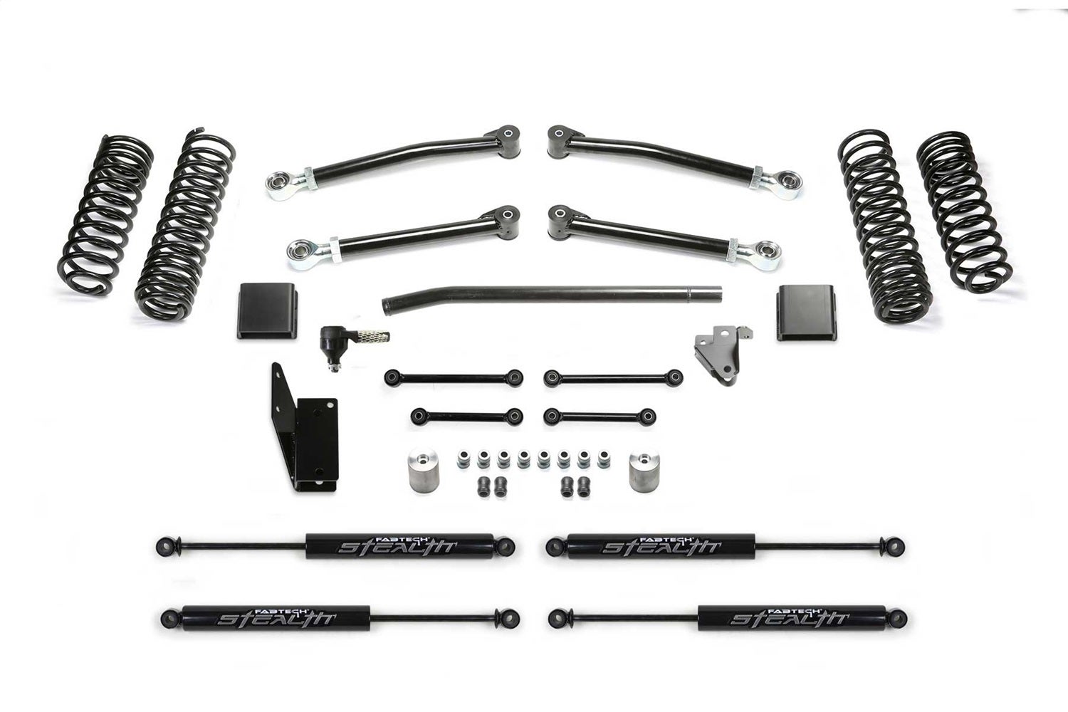 This Trail Lift Kit provides enhanced suspension performance to address all variants of off highway travel use including rock crawling, aggressive trail use and overland expeditions. This Gladiator lift kit has been tuned with proper dual rate coil springs and shock valving to provide a very compliant ride that you will appreciate. The system is a complete short arm suspension that utilizes the factory lower control arm mounts for an easy installation. The Fabtech lower link arms are constructed of thick wall steel tubing that are guaranteed never to bend. They come with large polyurethane bushings on one end with internal threads on the other to accept the groundbreaking Fabtech 5 Ton Joint(R) for longevity and a quiet ride. Fabtech's dual rate Gladiator coil springs are corner specific to the Jeep JT. This keeps the vehicle level side to side and allows for increased suspension travel. The first stage of the spring provides a soft ride with the ability to extend for additional travel. The second stage is designed to handle the payload of the vehicle and address large impact absorption at higher speeds. To address the steering geometry with the increased ride height, a Draglink Flip kit along with a heavy duty Track Bar bracket is included. This relocates the Gladiator steering geometry to the factory plane allowing for full articulation without binding the draglink ends in extreme conditions. The rear Gladiator suspension receives a heavy duty Track Bar bracket to center the axle under the vehicle with the new ride height and help retain the factory roll center of the vehicle. Front and rear bumps stop extensions protect the Jeep Gladiator suspension from over cycling. This popular Jeep Gladiator lift kit is a top choice for daily drivers that enjoy tackling tough trails and overlanding with the comfort that they have a high quality complete suspension under their Gladiator.