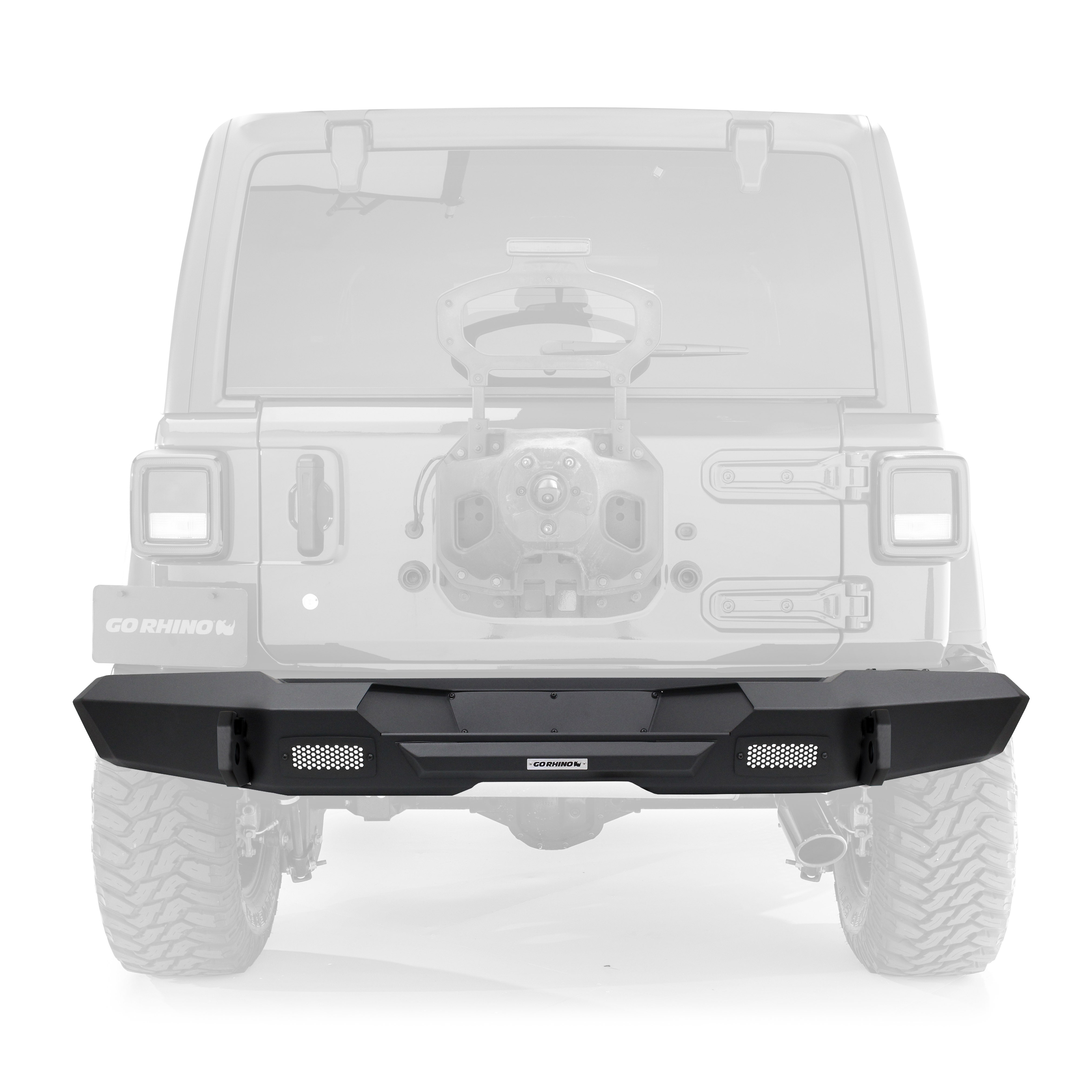 Full featured full width bumper installs quickly and easily Full width bumper features wide corner end caps Wide corners provide safe step area when accessing roof racks-perfect for overlanding and camping Compatible with factory hitch Allows for installation of two clearance compatible flush-mount lights. Compatible with Go Rhino Lift Assist Tire Carrier 1"" Thick steel shackle mounts with patented signature rhino horn tow hook Center Step Area for enhanced vehicle access and to allow use of larger spare tires Black Powdercoated Finish