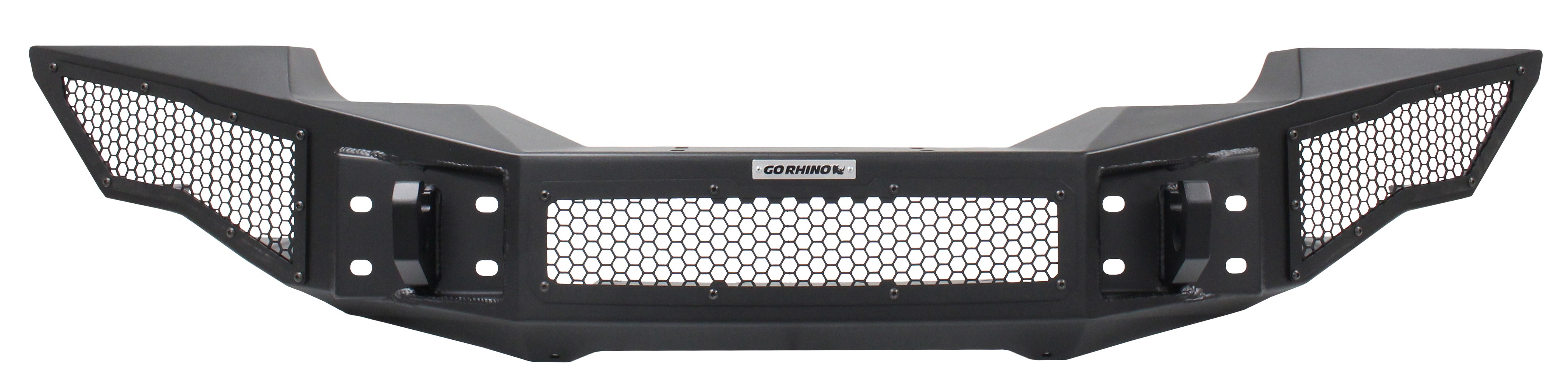 Wrangler JK, JL and JT Rockline Winch Ready Front Full Width Bumper w/ signature hex mesh LED protective cover for use with either an industry standard 20" double row LED bar or up to 4" standard cube LED's. Includes patented Rhino Hook D-Ring mounts