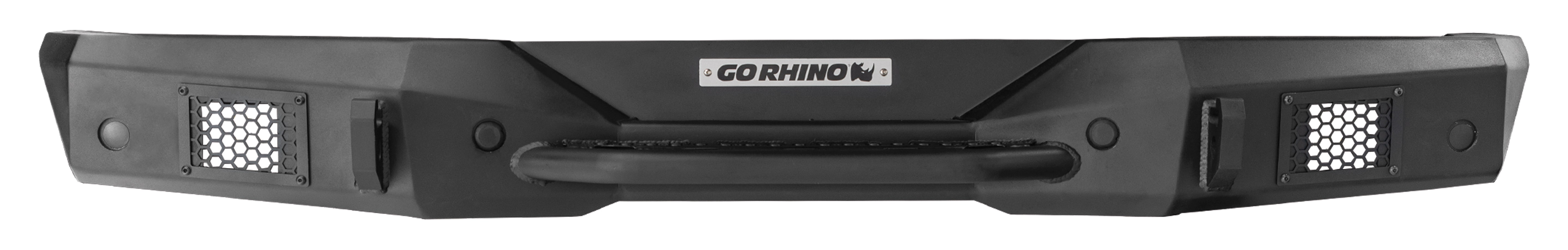 Rockline Rear Full Width Bumper with ultra slim design for enhanced tire clearance and features signature hex mesh LED protective covers for use with industry standard cube LED lights. Easy Installation-no cutting or drilling required
