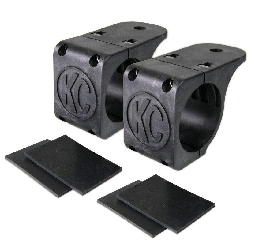 FEATURES-2 x 2-Piece Black Tube Clamp Mounting Bracket-Fits 1-3/4" to 2" Diameter Round Light Bars-Super Strong Glass Injected Nylon Composite-Rubber Adjustment Shims for easy and Accurate Fitment-Designed to Universally Mount Any KC HiLiTES Light EASY INSTALL AND FITMENTEasily add auxiliary lighting to your vehicle with additional Light Tabs. Designed to fit 1.75" to 2" Diameters, our Universal Tube Clamp Mounts work with most popular lights to your vehicle, creating extra light tabs for attaching additional light to your off road vehicle. Attach on almost any piece of tubular metal, from bumpers and grille guards to light bars and roof racks, mounting lights has never been easier. HIGH GRADE CONSTRUCTION AND DURABILITYForget rust-prone steel, KC HiLiTES has constructed these heavy duty Tube Clamp Mounts using glass filled Nylon composite material designed to be impact resistant and waterproof. Ready to take on the harshest terrains and most grueling conditions imaginable. FINE TUNED LIGHT ADJUSTMENTEach Tube Clamp Mount comes complete with a pair rubber shims for a fine tune fitment of lights, securely attaching your lights with a range of adjustability for your lighting needs. Forget rust-prone steel, KC HiLiTES has constructed.