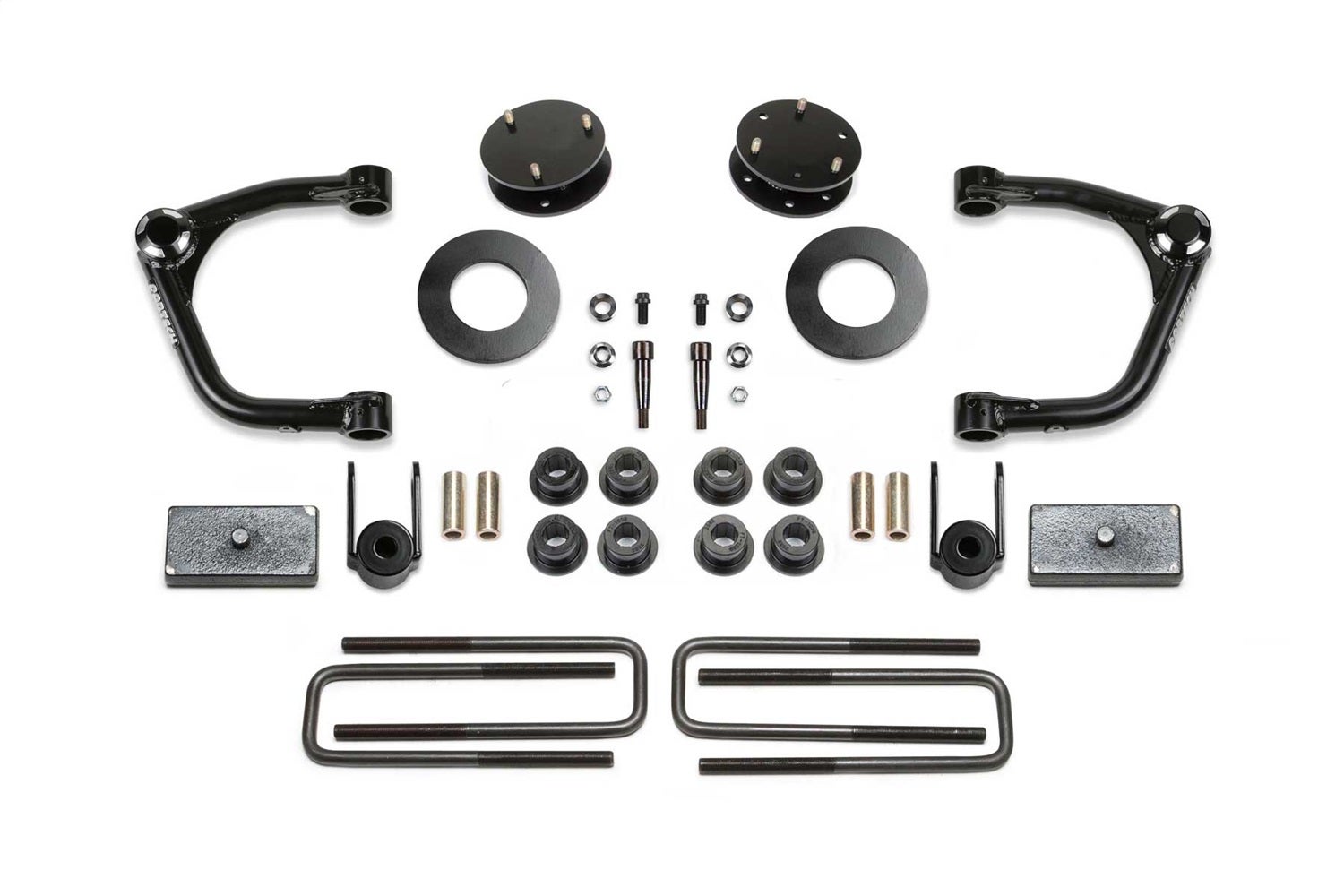 Fabtech's Upper Control Arm system provides a 3.5 in. increased ride height over stock without creating suspension bind at full droop. Lift is accomplished with steel spacers that utilize the factory coilover shocks for a smooth ride. The heavy duty Uniball Upper Control Arms are constructed of the finest material with .120 in. wall 1.50 in. OD 4130 Chromoly tubing. High quality 1 in. FK Stainless PTFE lined Uniball bearings are utilized in place of ball joints. These super stout Control Arms are designed for increased longevity in rugged offroad conditions while providing a more positive on road feel. Rear lift comes from 1.5 in. blocks and u-bolts.