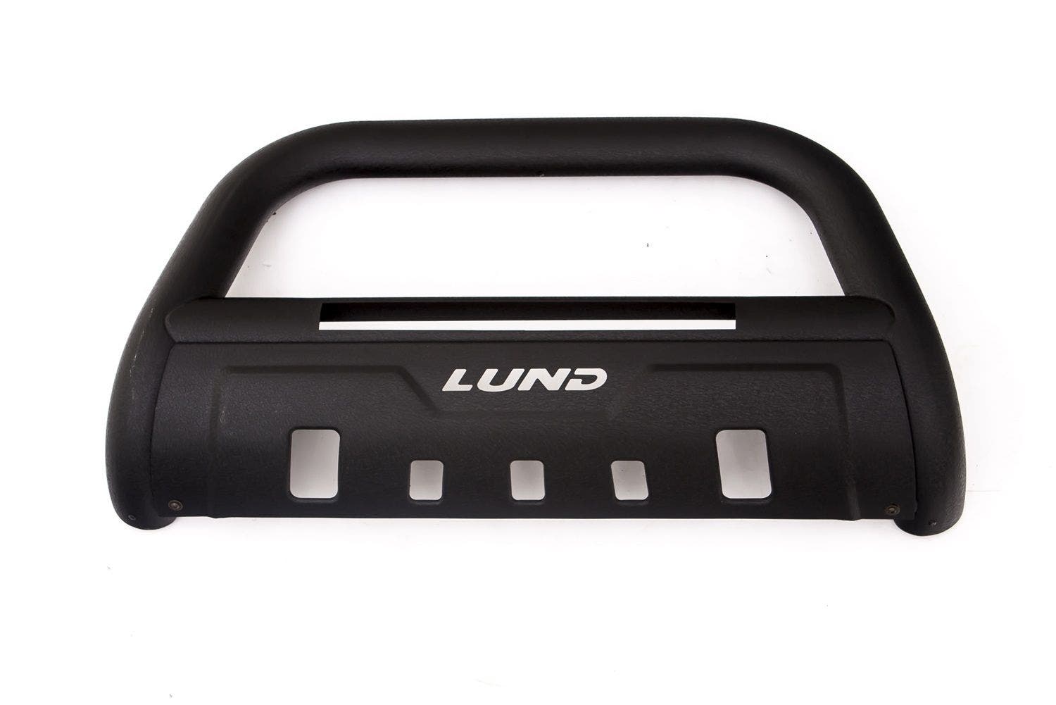 Protects your front end from flying debris with 3.5 inches of oval steel tubing. These bull bars also boost your visibility with an integrated 20 inch LED light bar. The included heavy duty light bar illuminates your night driving with a bright flood beam pattern and is easily wired into your factory light wiring, or a wiring harness can be purchased separately. Available in black textured powder coat or polished T304 stainless steel finish. Our popular LUND bull bars may now be ordered with a wire harness kit. The wire harness kit is also sold separately for lighting and accessories up to 30 Amps. LUND's bull bars with LED light bar and wiring kit is the total package to "see and be seen", providing complete front end -- style, lighting and protection.