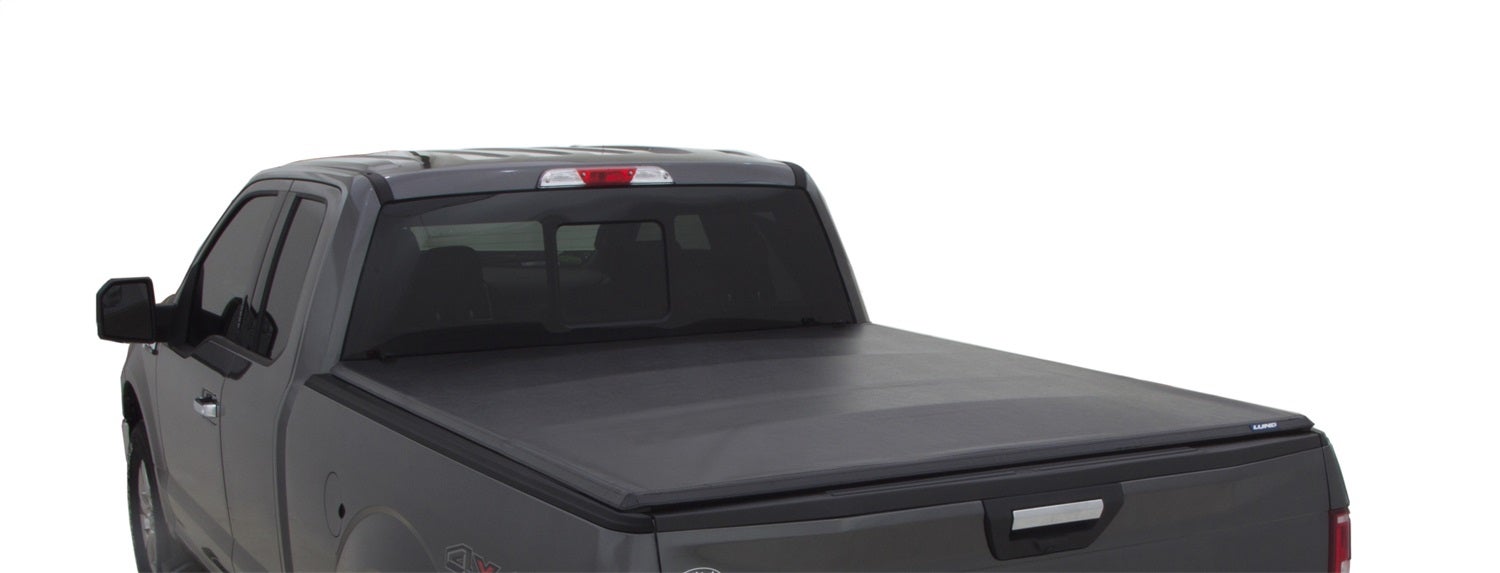 The LUND(R) Genesis(TM) Tri-Fold Tonneau cover features a low-profile design and black leather appearance premium vinyl top. The Genesis Tri-Fold design combines the flexibility of a Tri-Fold and the performance of a full, one-piece seamless cover to protect your gear and cargo. The Genesis Tri-Fold also utilizes a rigid, black powder-coated aluminum sub-frame, commercial-grade clamping system and tailgate seal. Genesis(TM)Tri-Fold allows 100% access to your entire truck bed with an integrated clip and strap system that allows the vehicle to operate with the top in the open (folded) position. The cover comes fully-assembled, requires no drilling or special hardware and can be installed in less than five minutes. Each Genesis Tri-Fold is customized for a precise fit on the specific make, model, year and bed size of your truck.