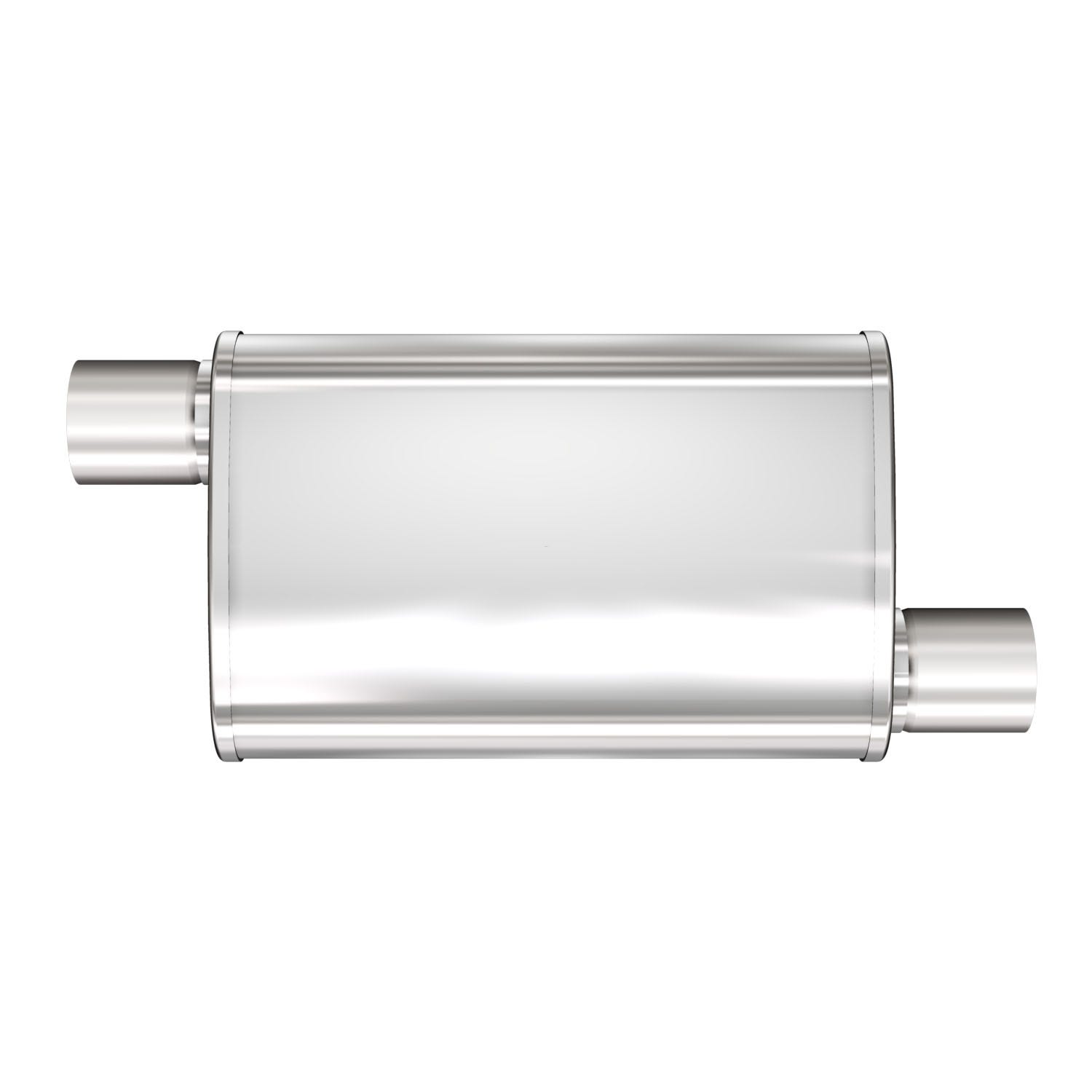 XL 3 Chamber Muffler; 4 x 9 in. Oval Body; 2.25 in. Inlet/Outlet; 14 in. Body/20 in. Overall Length; Offset/Offset; Satin Stainless Steel;