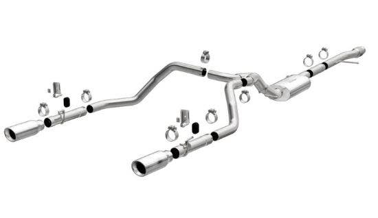 The MagnaFlow Street Series 19471 brings out the personality of your Truck with our signature resonant, powerful engine tone and dyno-proven performance. Thanks to its fast-flowing, mandrel bent 3in. main piping and 1 Straight-Through mufflers ending in a Dual Split Rear exit with 4in. Polished Welded-On-Double Wall-Angle Cut-Rolled Edge tips, this Truck exhaust kit has the performance chops to match its sporty sound and appearance. Upgrade your ride to the next level with an exhaust that has the pipes to put other Truck's to shame. With this system your vehicle will be producing Agressive exterior and Moderate interior sound levels while leaving other cars and trucks feeling envious at every stoplight. Exhaust kit 19471 features a cat-back layout that replaces your ride's stock exhaust components from near the catalytic converter on back. Extensive 3D scanning during development has resulted in a direct-fit design that you can easily install yourself. 19471 is produced using CNC precision robotic manufacturing techniques and is backed by MagnaFlow's 1-year limited finish warranty and limited lifetime construction warranty.