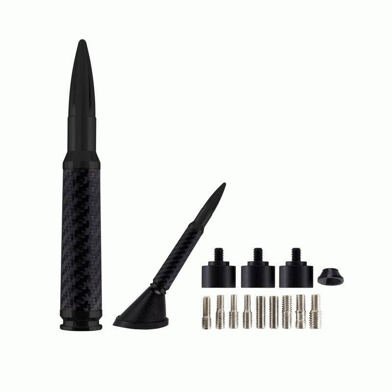 New line of Ammotenna automotive antenna replacement masts! 0.50cal, 0.30cal, 7.62 mm and arrow styles. Each Ammotenna mast is made from 6061 billet aluminum. Multiple adapters are included to Fit most applications including the new Jeep 5/16th thread. Every kit includes a rubber grommet that will help keep moisture out. Each round comes in a wide range of finishes: brass, billet, carbon fiber, gun metal, and anodized black. We also have hydro dipped finishes in some popular designs such as: muddy girls, wildfire, Kryptek, digital camo, the US flag and more. Each antenna CAN easily be mounted on fender and roof applications. Most installations do not require any tools, on some just an adjustable wrench is all that is needed. Optimized for optimum reception of the FM band. With our short antenna, no more worrying about hitting low hanging brush, drive-thru or garage doors. Metras 50CF 5.5in black Billet Aluminum .50 Cal Replica Antenna Mast Billet with Black Carbon Fiber Wrap.