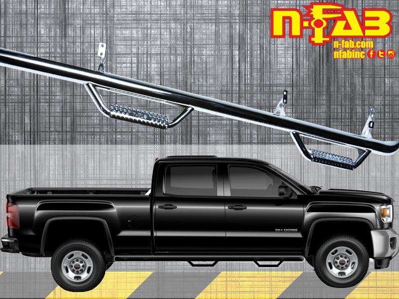 One of N-FAB's most popular styles is the Wheel to Wheel Nerf-Step. Utilizing N-FAB's patented hoop step design and innovative mounting system, N-FAB Wheel to Wheel Nerf Steps work on vehicles with and without body lift kits, with no modifications to brackets or bars. All N-FAB Wheel to Wheel Nerf Steps are built using .084 wall steel tubing and offer an industry high load rating of 465 pounds. All N-FAB Wheel to Wheel Nerf Steps are constructed as one-piece assemblies to provide maximum strength and durability not found in modular designs. Wheel to Wheel Nerf-Steps are designed and built specifically for each application, and mount high and tight to the vehicle cab for a clean factory look.