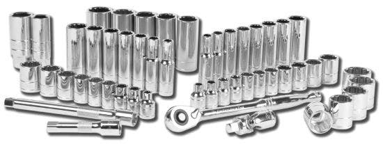 Set contents: 1pc. 3/8" dr. quick release ratchet, 1pc. universal joint, 2pcs. 3" and 6" extensions, 2pcs. spark plug sockets, 25pcs. SAE and metric std. sockets and 20pcs. SAE and metric deep sockets