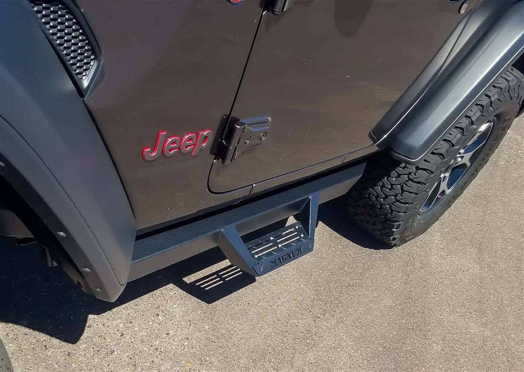 Magnum RT Steps give your truck a unique and rugged look. The Magnum RT side steps feature a sharp drop-down angled step design with a wide step area for easy entry and exiting of your truck. The side steps have a non-slip diamond tread pattern that allows drainage so that water, snow, or mud does not collect. The Magnum RT side steps fit to your vehicle's lower rocker, protecting from road grime or debris on or off the street. Made from 10 gauge steel and finished with a 3 stage black powder coating system. Quality guaranteed with a limited lifetime manufacturer warranty on the workmanship/structure and a 1 year limited manufacturer warranty on the black powder coated finish.