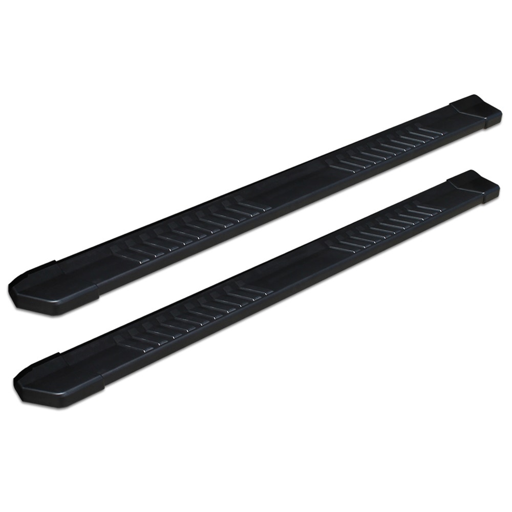 Raptor Series 6 inch OEM Style Black Textured Aluminum Slide Track Running Boards offer a full 6 inch step area and features slip resistant step treads. They offer a stylish look with their unique angled end caps and are offered in a modern black textured finish. They are constructed of anti-corrosion aircraft grade aluminum for long lasting durability and lightweight construction. All kits have a recommended weight rating of 400 lbs. Backed by a limited lifetime manufacturer warranty on the workmanship/structure and a 10 year limited manufacturer warranty on the black textured finish!These running boards are a part of our Slide Track Series product line. Each of our Slide Track Series products are equipped with a track system which will work with any of our vehicle specific brackets, allowing for an easy no-drill installation. The Slide Track system allows you to adjust the positioning of your running boards along your vehicle for a fit that is tailored to your liking. You also have the option to customize your truck with a different style of our slide track steps without having to change the brackets if your preference should change. All Slide Track Kits are compatible with Raptor Series branded bracket kit covers and 10 inch universal LED light strips (Sold separately). Thermoplastic bracket covers protect your brackets and provide them with a clean factory look. The 3M backed LED Light Strips are available in white and RGB and a great addition to easily add lighting to your steps.
