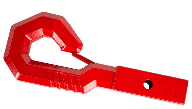 The Rugged Ridge Giga Hook is not just another recovery hook. It's massive, oversized "scorpion-tail" styling makes it as attention grabbing as it is functional. Each Giga Hook is tooled from high-strength AISI 4140 forged steel, packing enough brute strength to manage even the toughest off-road recoveries. A spring-loaded latch closure insures that tow straps stay in place on the Giga Hook, even when the load is released. The Giga Hook will be available soon in a wide variety of attractive powder coat finishes: Black, Red, Pink, Yellow and even Green for a world of possibilities. The Giga Hook works with any 2-inch receiver hitch and is guaranteed to take your recovery gear to the next level. Patent Pending